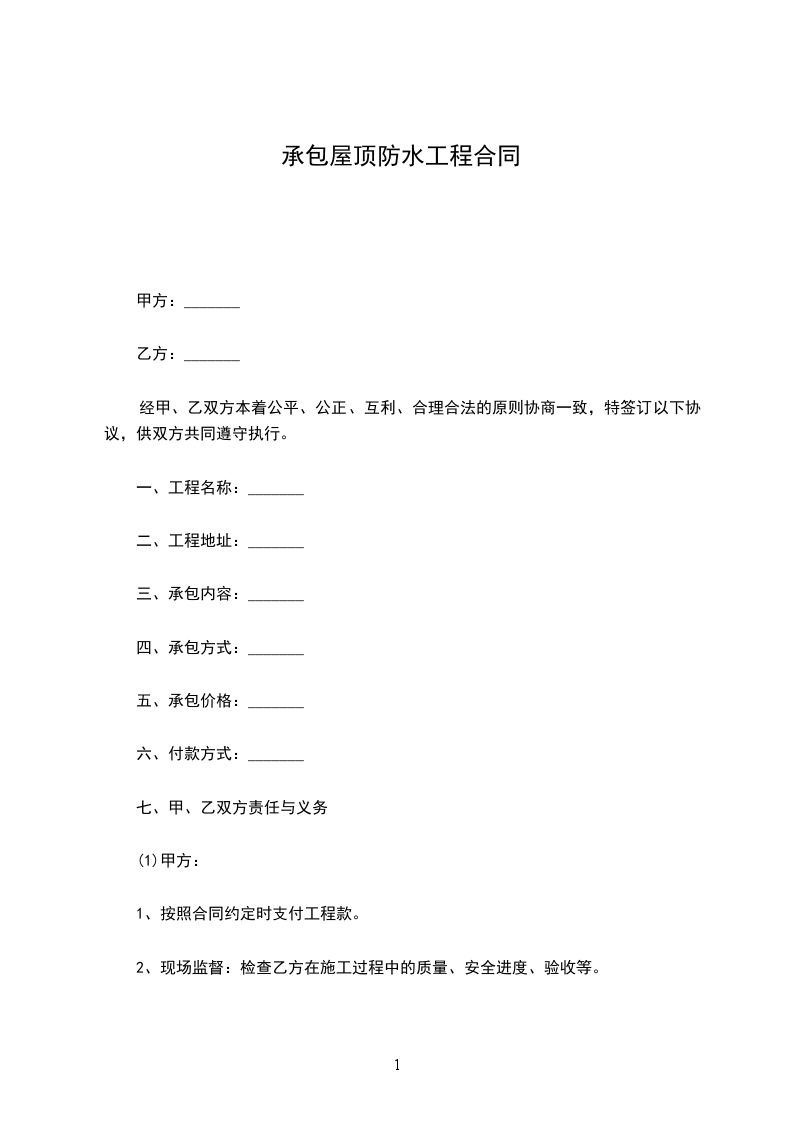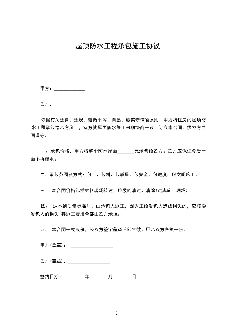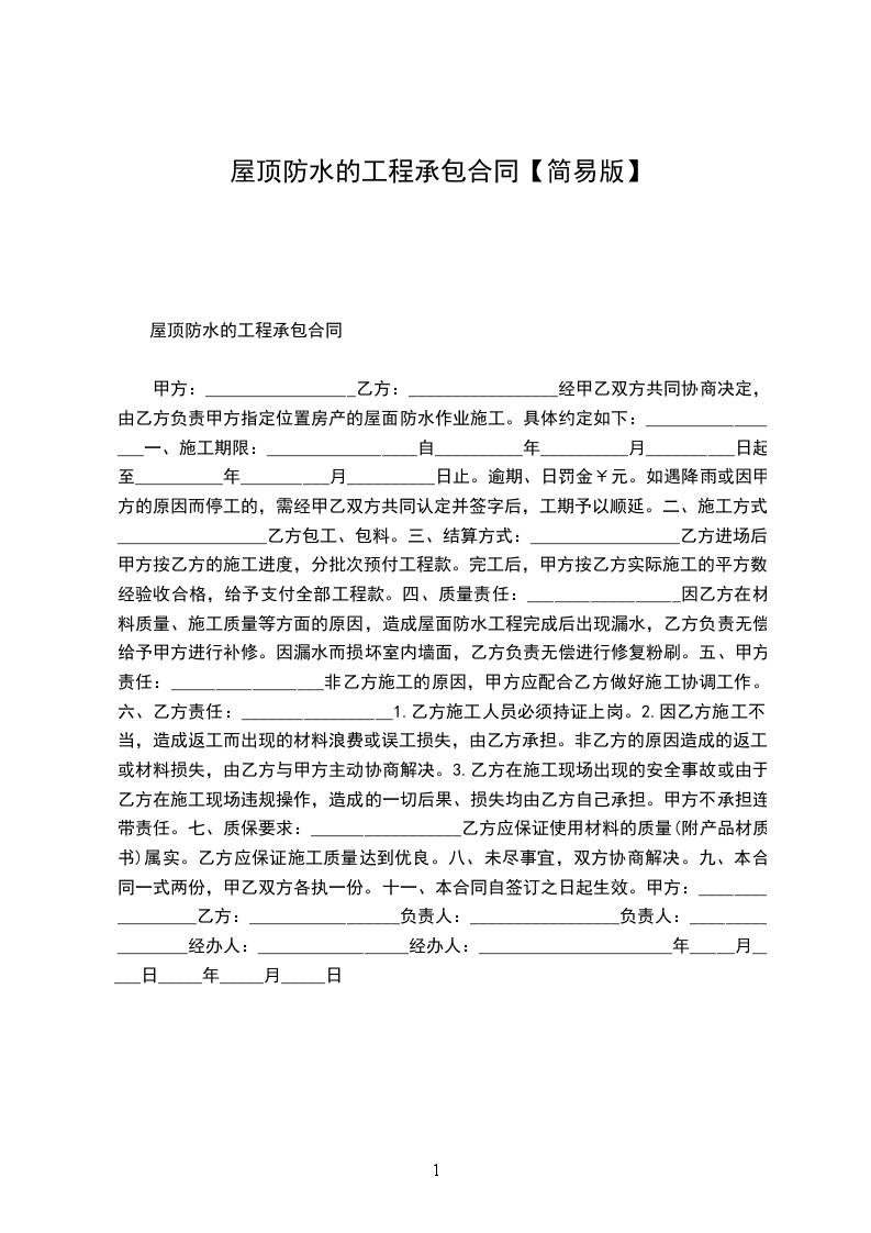 甲方:_________________乙方:_________________经甲乙双方共同协商决定,由乙方负责甲方指定位置房产的屋面防水作业施工。具体约定如下:_________________一、施工期限:_________________自__________年__________月__________日起至__________年__________月__________日止。逾期、日罚金¥元。如遇降雨或因甲方的原因而停工的,需经甲乙双方共同认定并签字后,工期予以顺延。二、施工方式:_________________乙方包工、包料。三、结算方式:_________________乙方进场后,甲方按乙方的施工进度,分批次预付工程款。完工后,甲方按乙方实际施工的平方数,经验收合格,给予支付全部工程款。四、质量责任:_________________因乙方在材料质量、施工质量等方面的原因,造成屋面防水工程完成后出现漏水,乙方负责无偿给予甲方进行补修。因漏水而损坏室内墙面,乙方负责无偿进行修复粉刷。五、甲方责任:_________________非乙方施工的原因,甲方应配合乙方做好施工协调工作。六、乙方责任:_________________1.乙方施工人员必须持证上岗。2.因乙方施工不当,造成返工而出现的材料浪费或误工损失,由乙方承担。非乙方的原因造成的返工或材料损失,由乙方与甲方主动协商解决。3.乙方在施工现场出现的安全事故或由于乙方在施工现场违规操作,造成的一切后果、损失均由乙方自己承担。甲方不承担连带责任。七、质保要求:_________________乙方应保证使用材料的质量(附产品材质书)属实。乙方应保证施工质量达到优良。八、未尽事宜,双方协商解决。九、本合同一式两份,甲乙双方各执一份。十一、本合同自签订之日起生效。甲方:_________________乙方:_________________负责人:_________________负责人:_________________经办人:_________________经办人:______________________年_____月_____日_____年_____月_____日