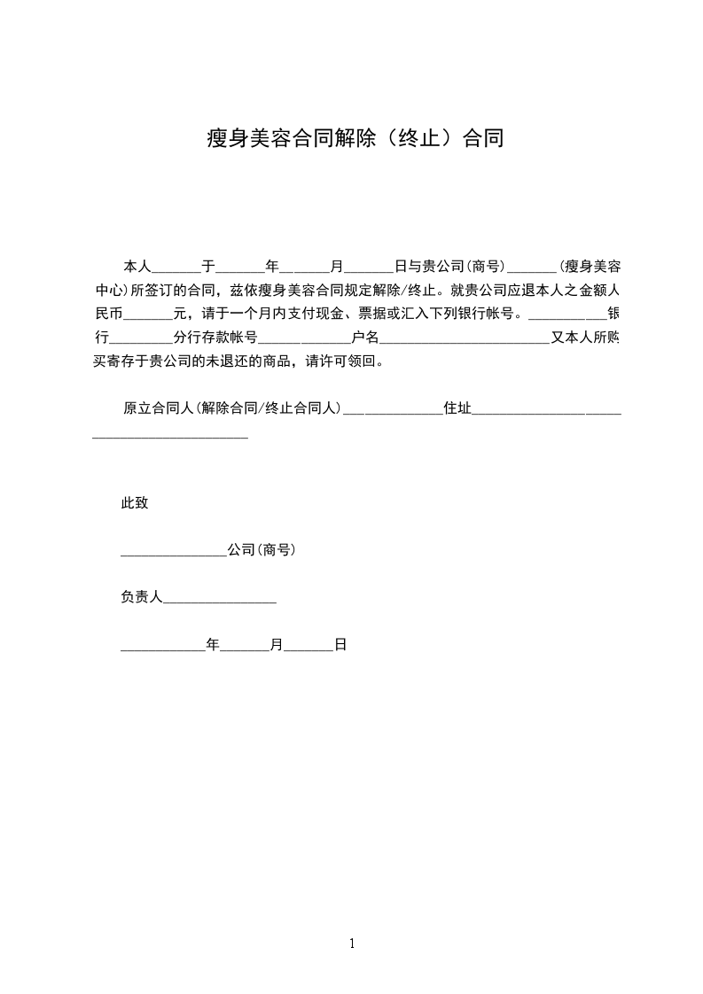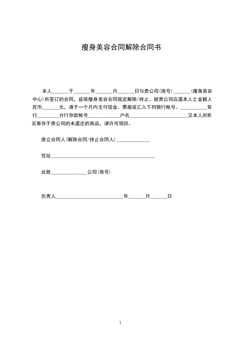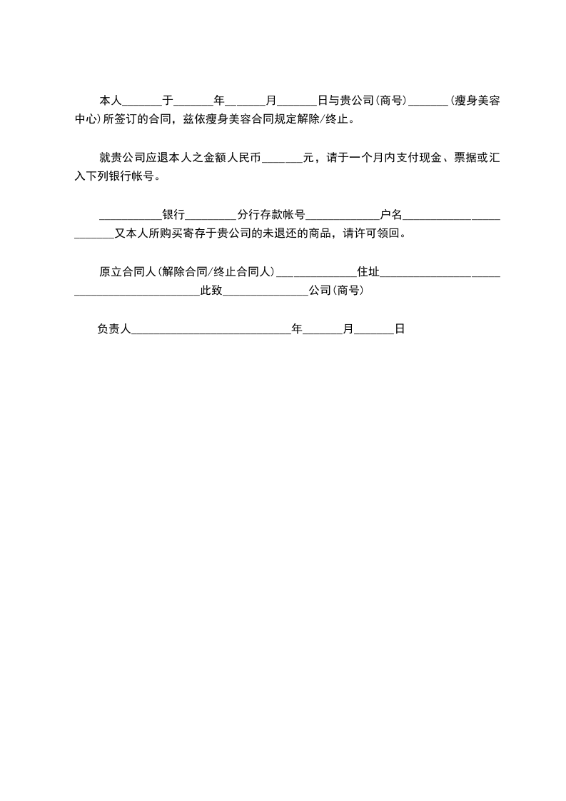 本人_______于_______年_______月_______日与贵公司(商号)_______(瘦身美容中心)所签订的合同,兹依瘦身美容合同规定解除/终止。就贵公司应退本人之金额人民币_______元,请于一个月内支付现金、票据或汇入下列银行帐号。___________银行_________分行存款帐号_____________户名________________________又本人所购买寄存于贵公司的未退还的商品,请许可领回。