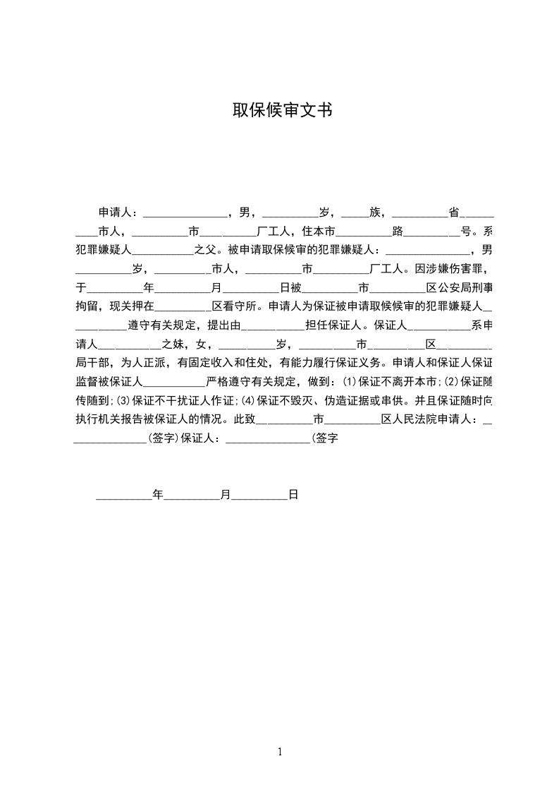 申请人:_______________,男,__________岁,_____族,__________省__________市人,__________市__________厂工人,住本市__________路__________号。系犯罪嫌疑人___________之父。被申请取保候审的犯罪嫌疑人:_______________,男,__________岁,__________市人,__________市__________厂工人。因涉嫌伤害罪,于__________年__________月__________日被__________市__________区公安局刑事拘留,现关押在__________区看守所。申请人为保证被申请取候候审的犯罪嫌疑人___________遵守有关规定,提出由___________担任保证人。保证人___________系申请人___________之妹,女,__________岁,__________市__________区__________局干部,为人正派,有固定收入和住处,有能力履行保证义务。申请人和保证人保证监督被保证人___________严格遵守有关规定,做到:(1)保证不离开本市;(2)保证随传随到;(3)保证不干扰证人作证;(4)保证不毁灭、伪造证据或串供。并且保证随时向执行机关报告被保证人的情况。此致__________市__________区人民法院申请人:_______________(签字)保证人:_______________(签字