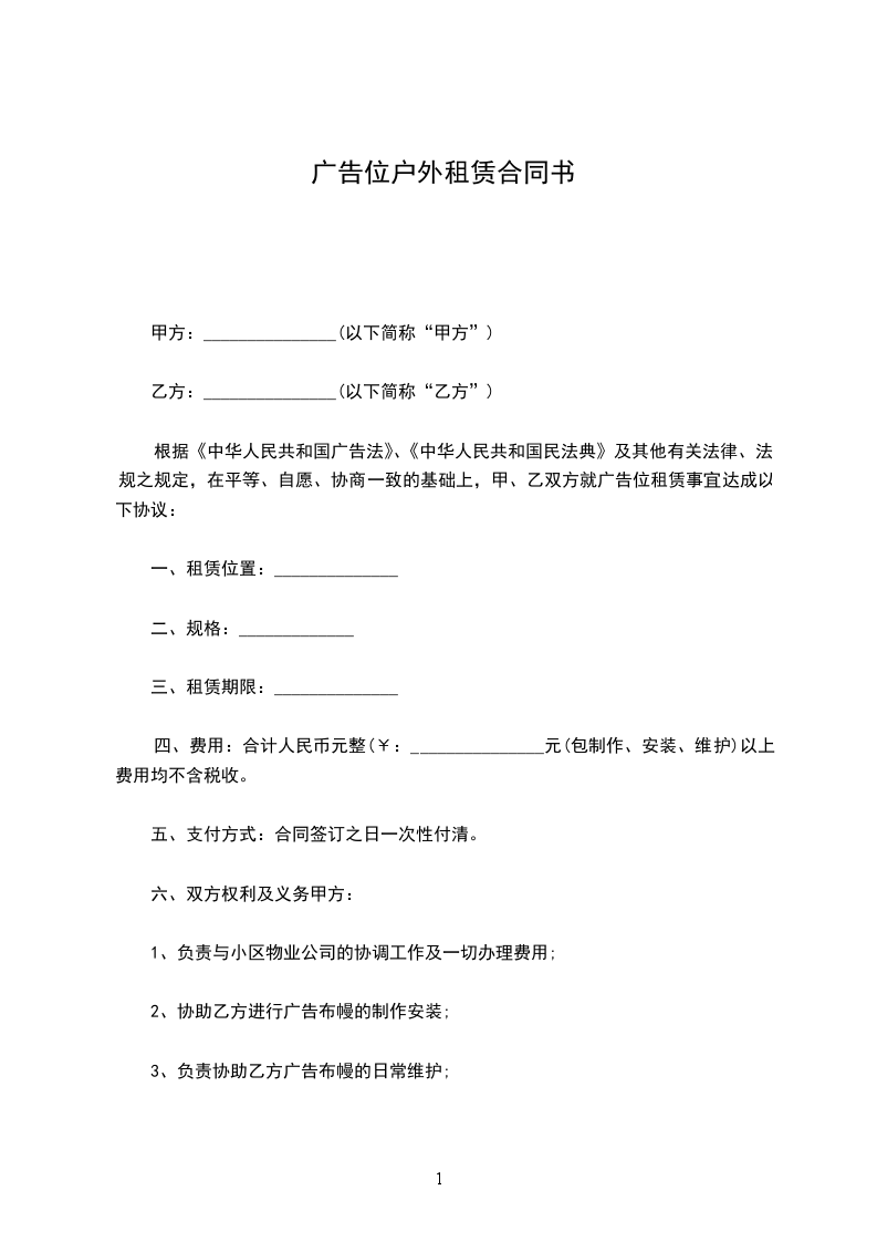 根据《中华人民共和国广告法》、《中华人民共和国民法典》及其他有关法律、法规之规定,在平等、自愿、协商一致的基础上,甲、乙双方就广告位租赁事宜达成以下协议:
