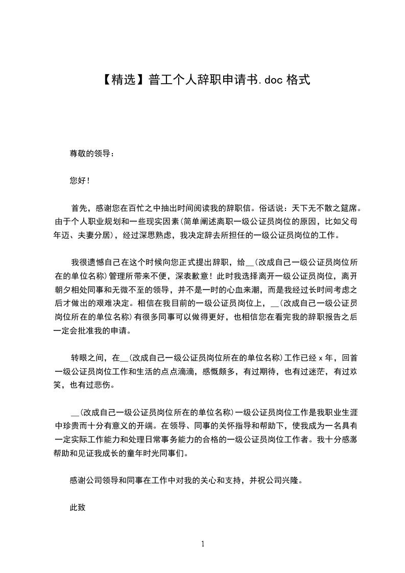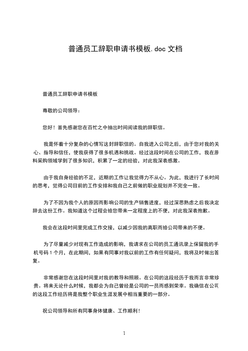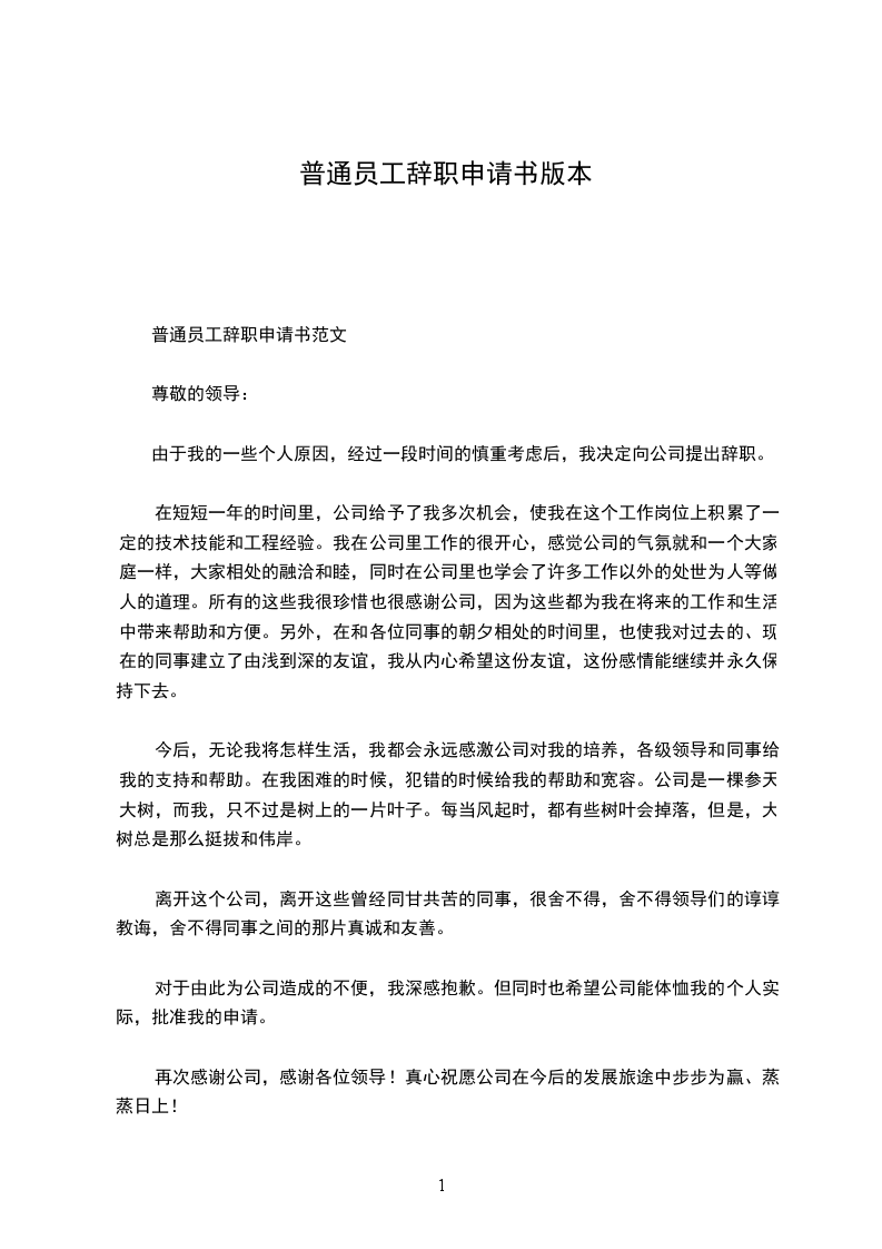 普通员工辞职申请书模板