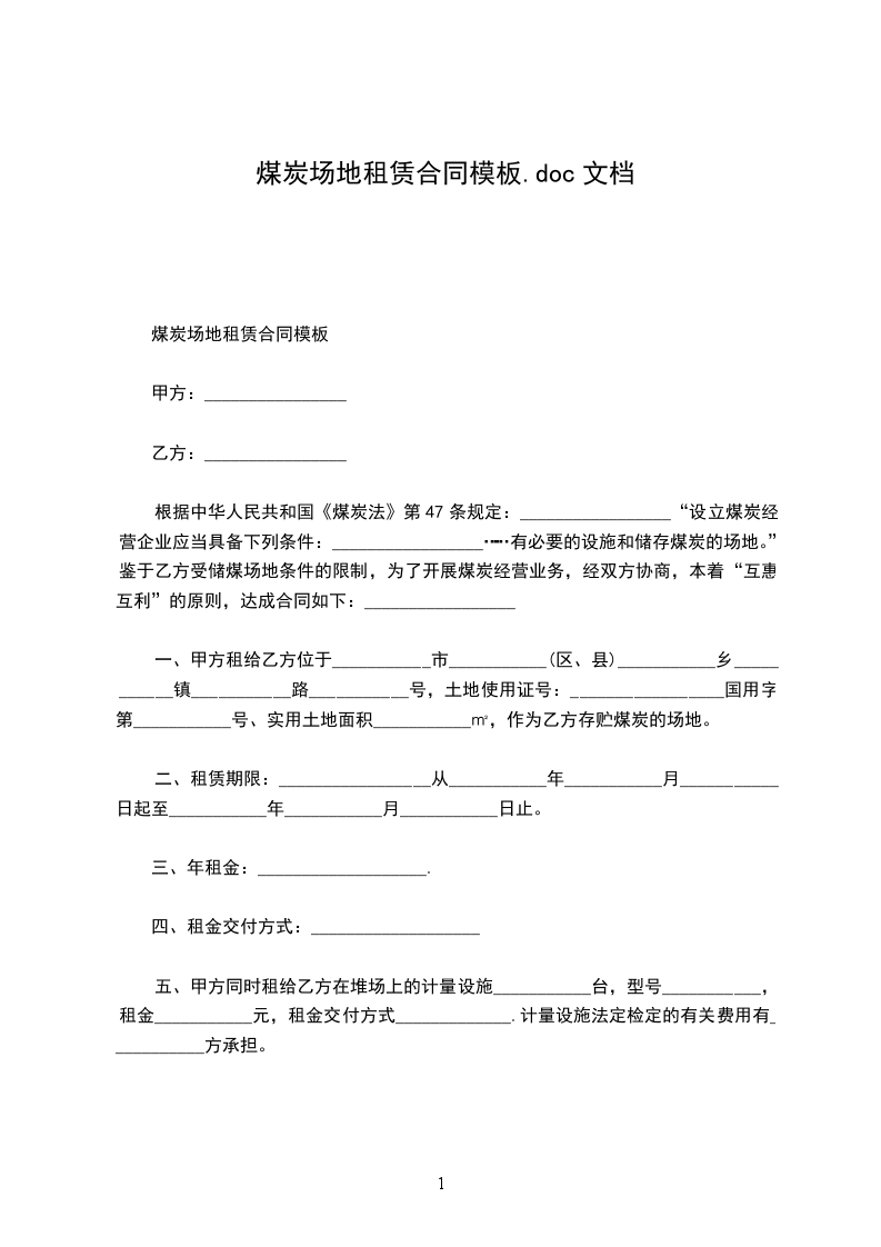 一、甲方租给乙方位于___________市___________(区、县)___________乡___________镇___________路___________号,土地使用证号:_________________国用字第___________号、实用土地面积___________㎡,作为乙方存贮煤炭的场地。