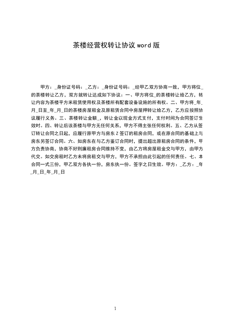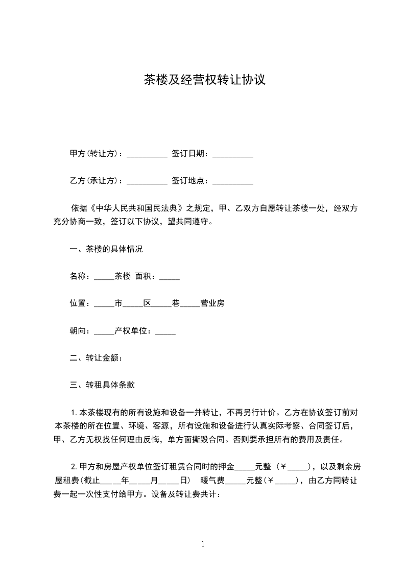 一、甲方将位于____的茶楼转让给乙方,转让内容为茶楼平方米租赁使用权及茶楼所有配套设备设施的所有权。