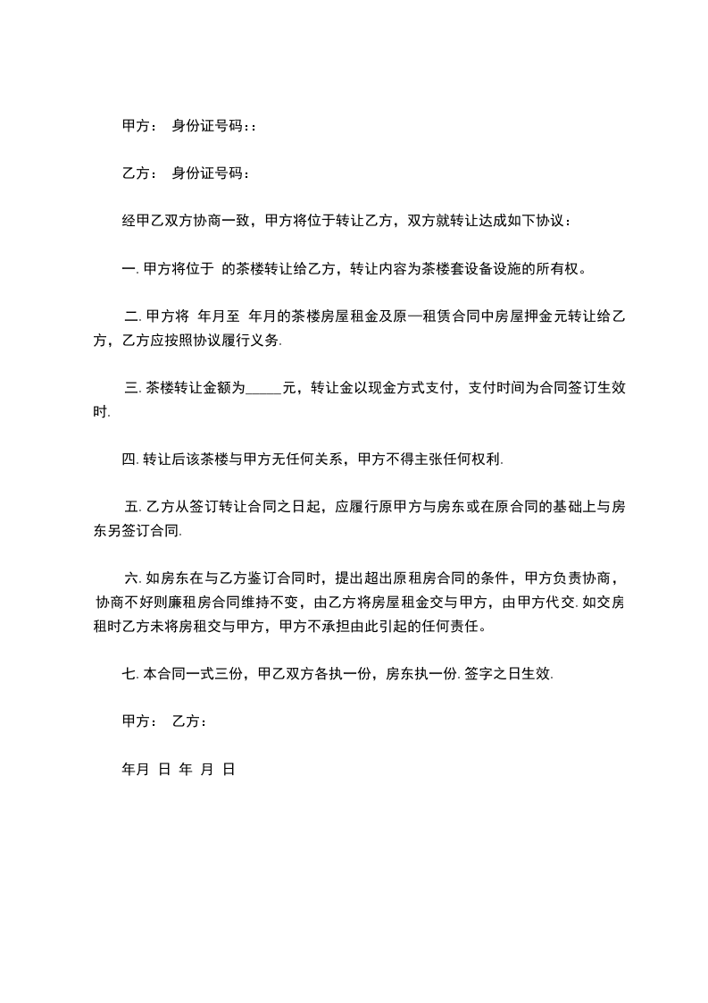 四、转让后该茶楼与甲方无任何关系,甲方不得主张任何权利。