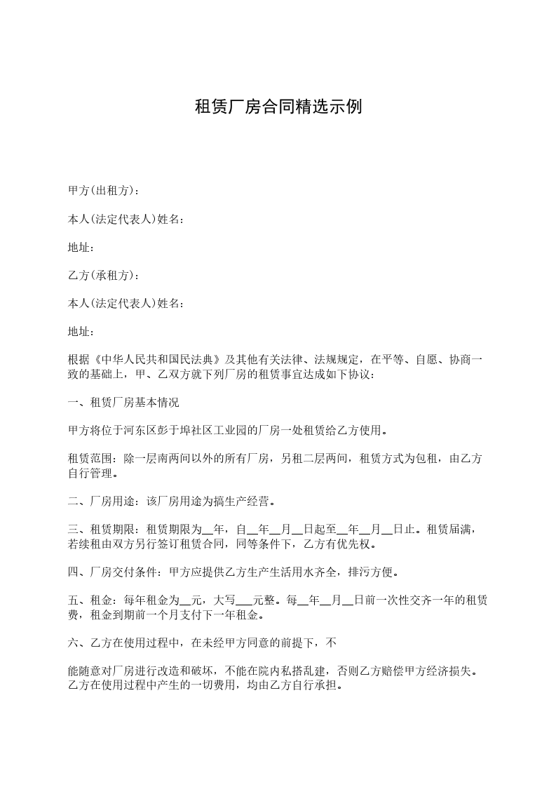二、乙方租用该厂房期限为三年,即自__________年______月_____日至__________年______月_____日止。前30天为装修期,装修期内甲方免收租金。正式起租时间为__________年______月_____日。