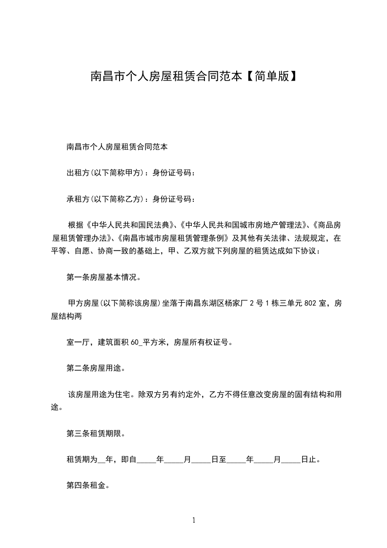 南昌市个人房屋租赁合同范本