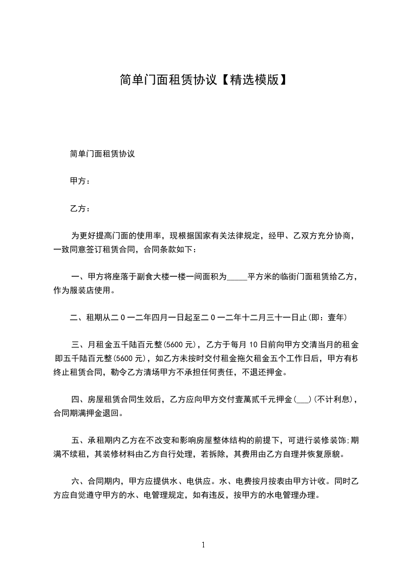 简单门面租赁协议