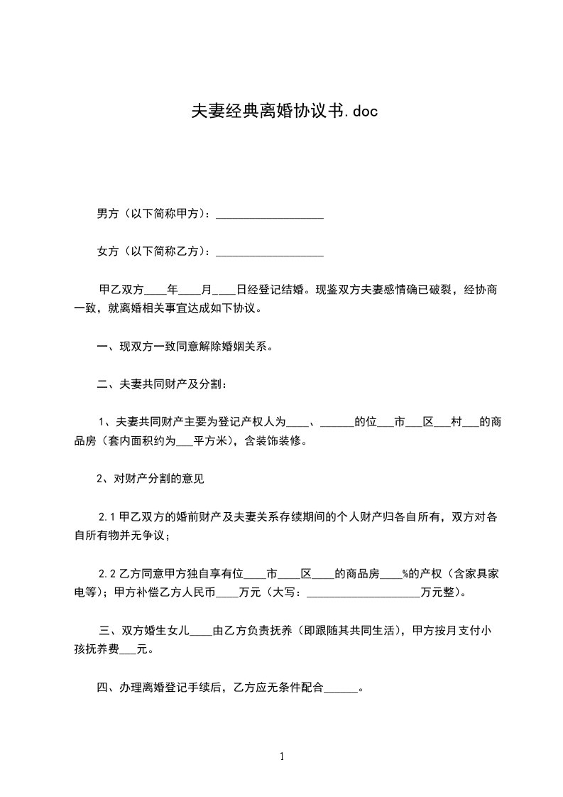 夫妻财产协议书经典范本一