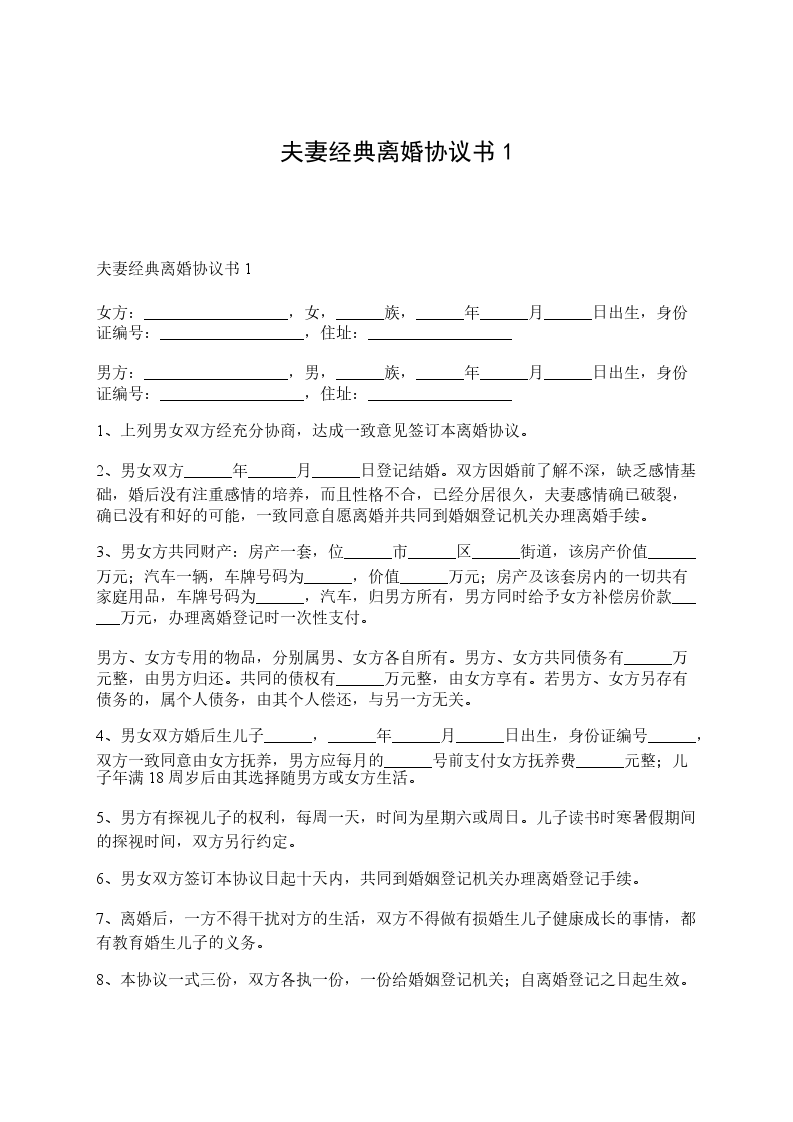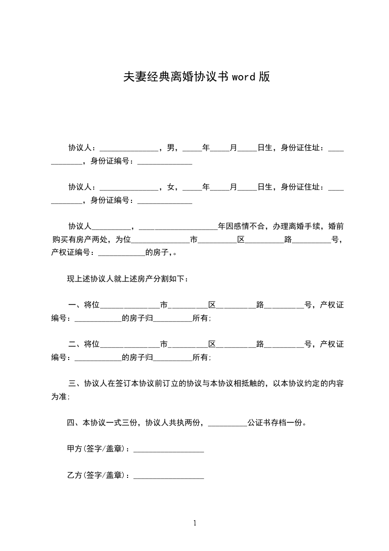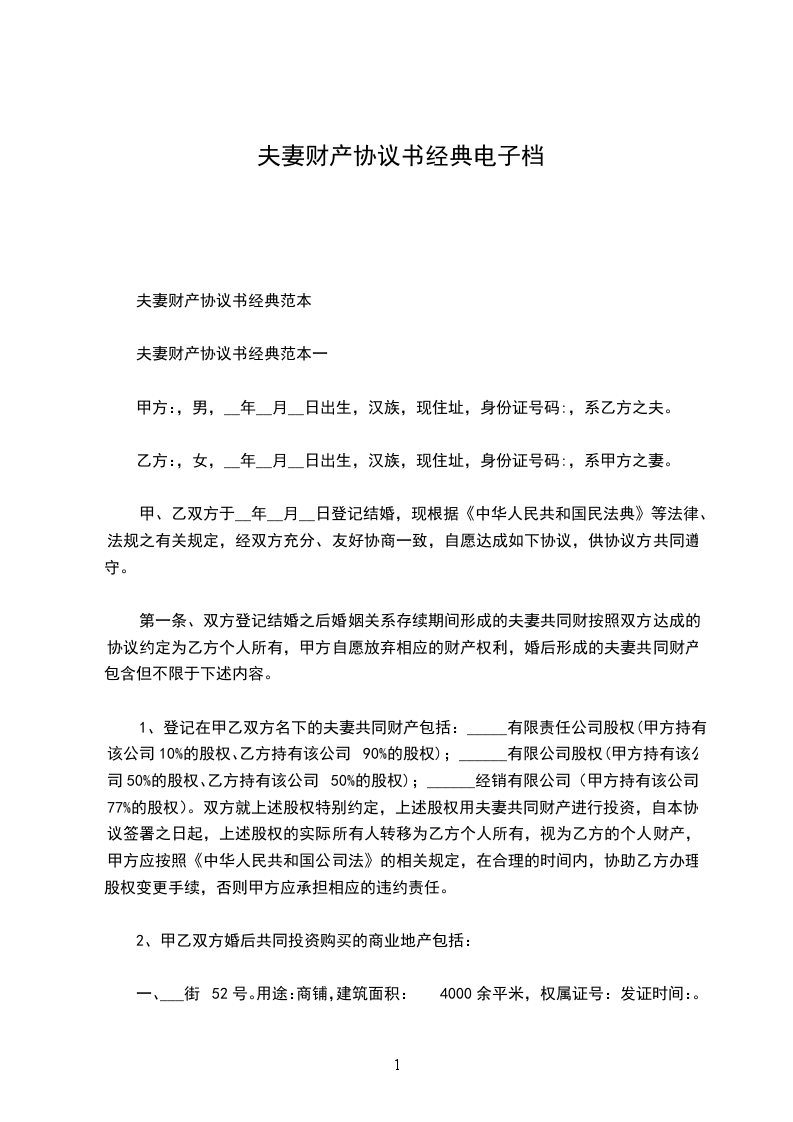 夫妻财产协议书经典范本