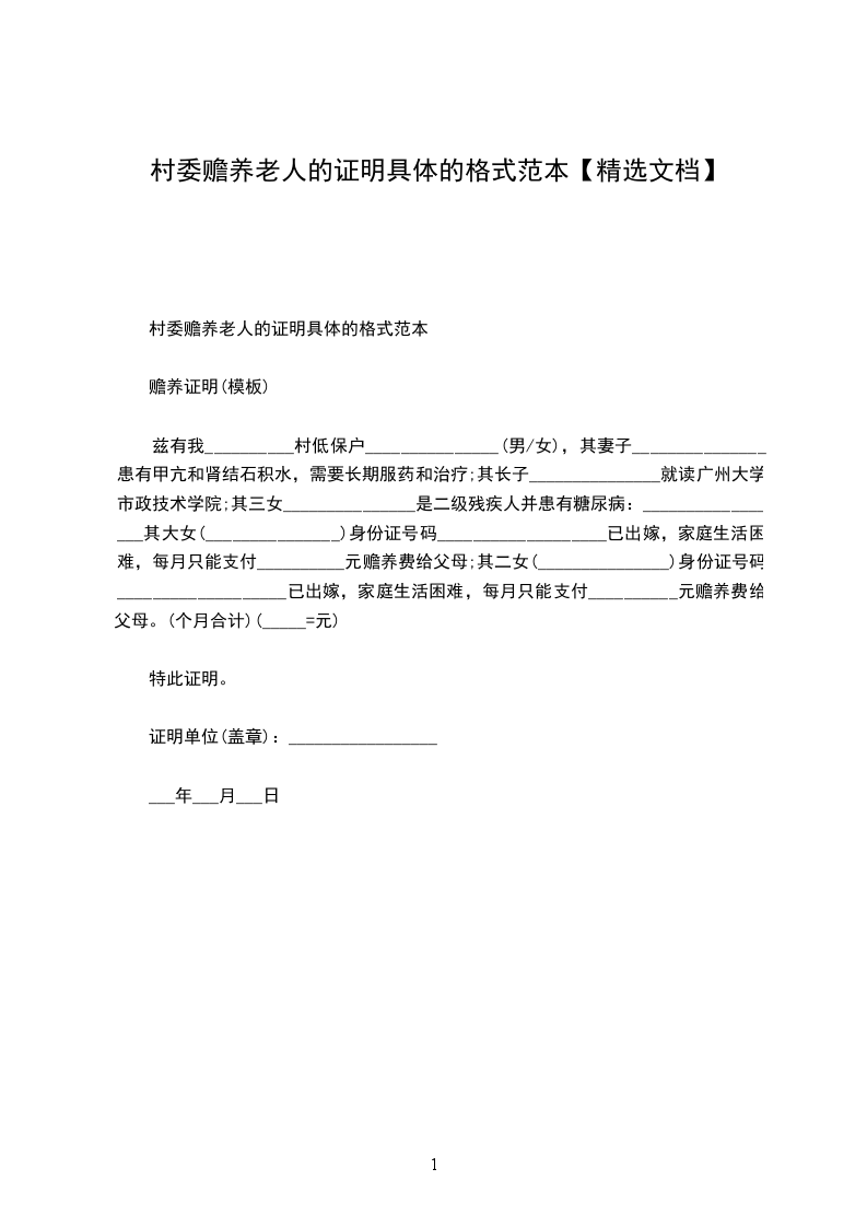 村委赡养老人的证明具体的格式范本