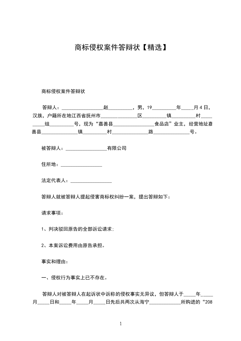 答辩人:_________________赵__________,男,19__________年_____月4日,汉族,户籍所在地江西省抚州市_______________区__________镇__________村__________组__________号,现为“嘉善县_________________食品店”业主,经营地址嘉善县_______________镇__________村_______________路_______________号。
