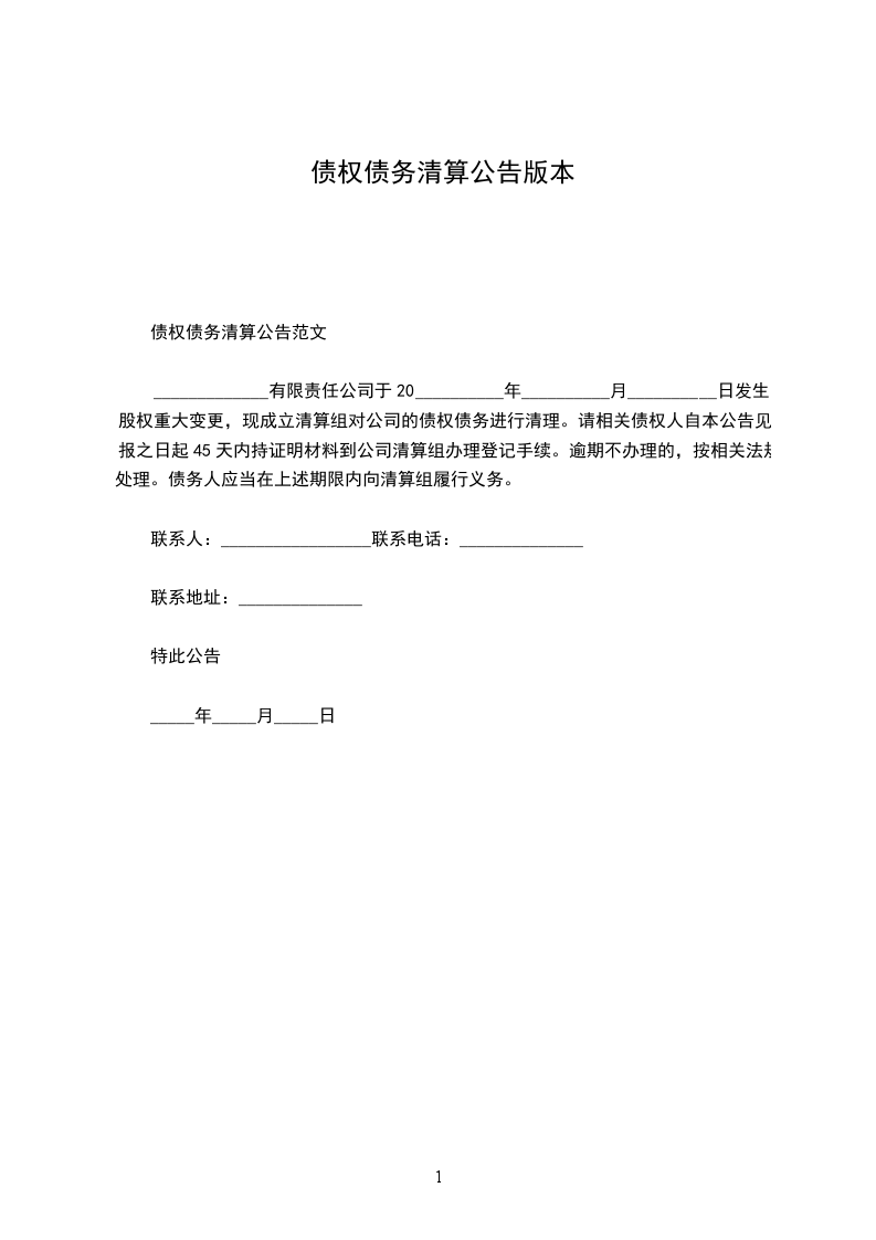 _____________有限责任公司于20__________年__________月__________日发生股权重大变更,现成立清算组对公司的债权债务进行清理。请相关债权人自本公告见报之日起45天内持证明材料到公司清算组办理登记手续。逾期不办理的,按相关法规处理。债务人应当在上述期限内向清算组履行义务。