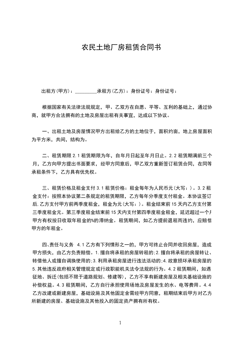 一、出租土地及房屋情况甲方出租给乙方的土地位于,面积约亩,地上房屋面积为_____平方米,共间,结构为。