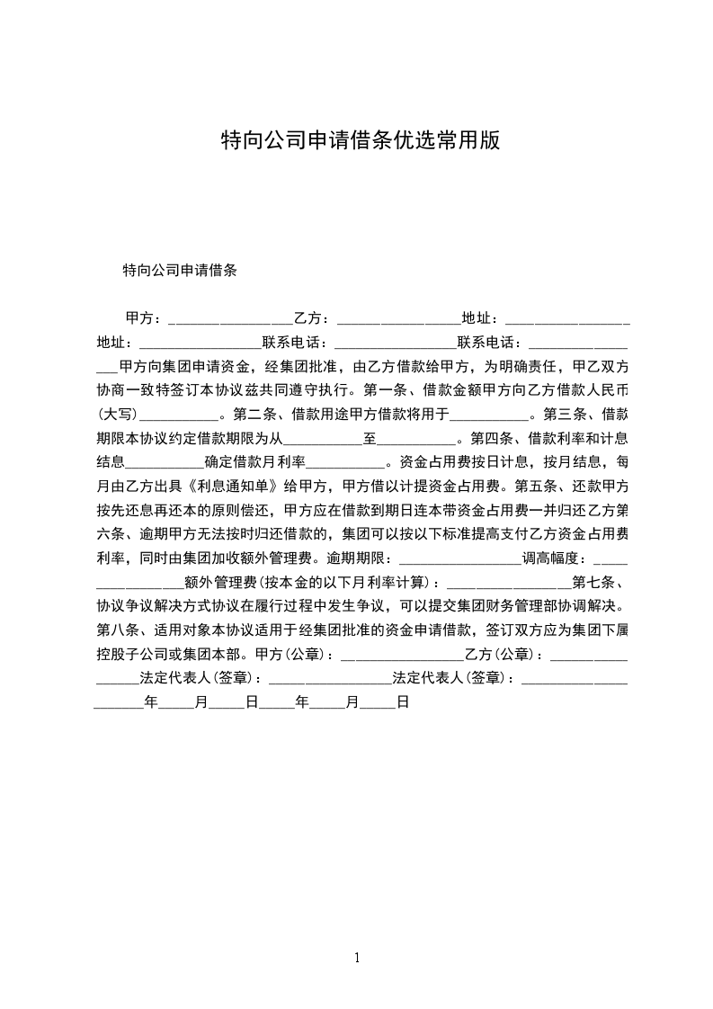 甲方:_________________乙方:_________________地址:_________________地址:_________________联系电话:_________________联系电话:_________________甲方向集团申请资金,经集团批准,由乙方借款给甲方,为明确责任,甲乙双方协商一致特签订本协议兹共同遵守执行。第一条、借款金额甲方向乙方借款人民币(大写)___________。第二条、借款用途甲方借款将用于___________。第三条、借款期限本协议约定借款期限为从___________至___________。第四条、借款利率和计息、结息___________确定借款月利率___________。资金占用费按日计息,按月结息,每月由乙方出具《利息通知单》给甲方,甲方借以计提资金占用费。第五条、还款甲方按先还息再还本的原则偿还,甲方应在借款到期日连本带资金占用费一并归还乙方第六条、逾期甲方无法按时归还借款的,集团可以按以下标准提高支付乙方资金占用费利率,同时由集团加收额外管理费。逾期期限:_________________调高幅度:_________________额外管理费(按本金的以下月利率计算):_________________第七条、协议争议解决方式协议在履行过程中发生争议,可以提交集团财务管理部协调解决。第八条、适用对象本协议适用于经集团批准的资金申请借款,签订双方应为集团下属控股子公司或集团本部。甲方(公章):_________________乙方(公章):_________________法定代表人(签章):_________________法定代表人(签章):______________________年_____月_____日_____年_____月_____日
