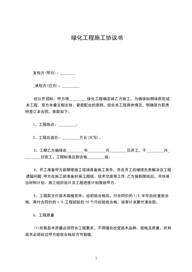 经公开招标,甲方将_________绿化工程确定给乙方施工,为确保如期保质完成本工程,双方本着互相支持、紧密配合的原则,结合本工程具体情况,明确双方职责,特签订本合同,条款如下: