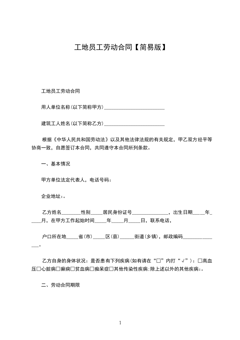 工地员工劳动合同