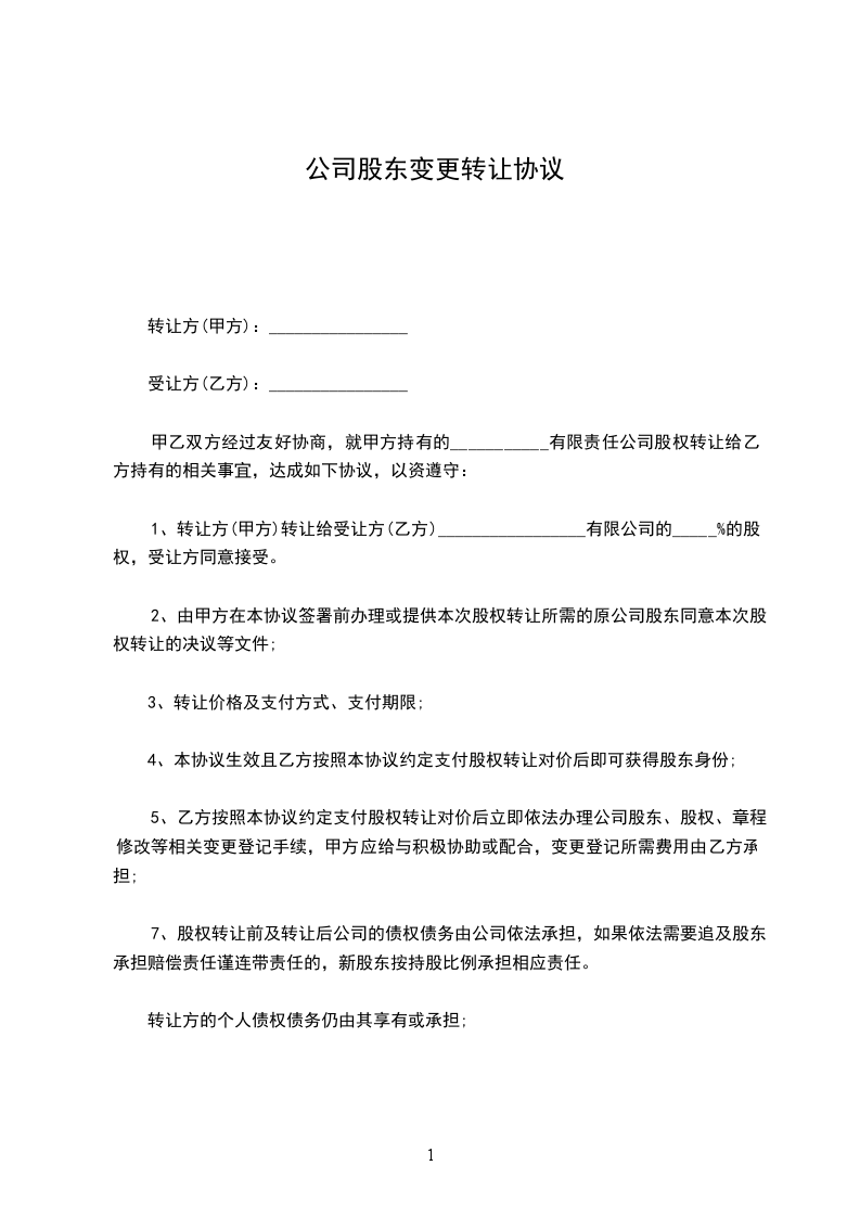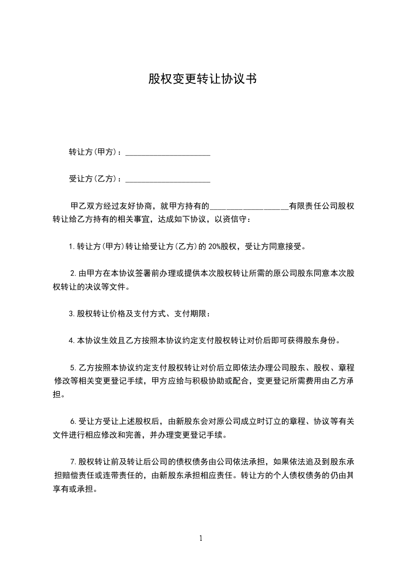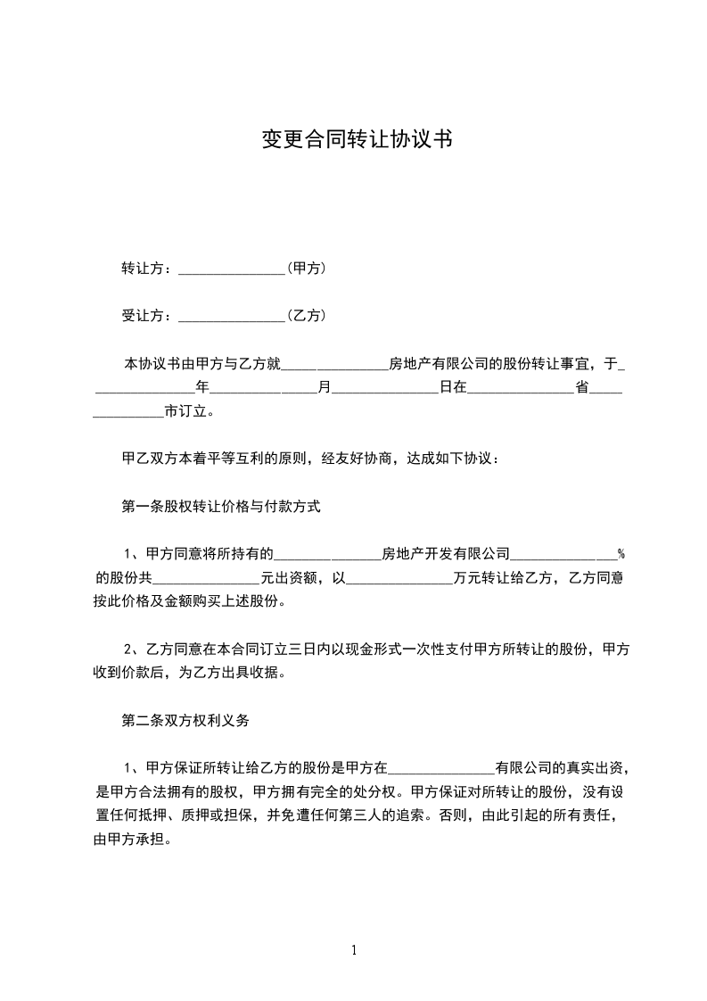 1、甲方同意将所持有的_______________房地产开发有限公司_______________%的股份共_______________元出资额,以_______________万元转让给乙方,乙方同意按此价格及金额购买上述股份。