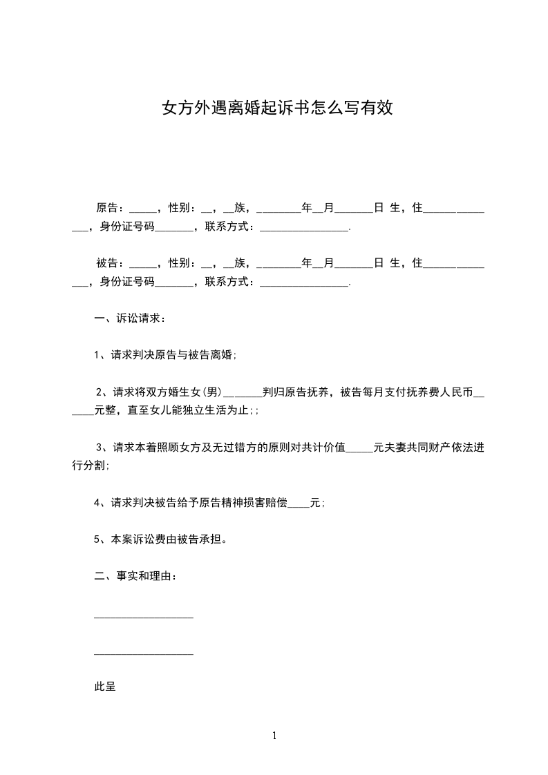 女方外遇离婚起诉书