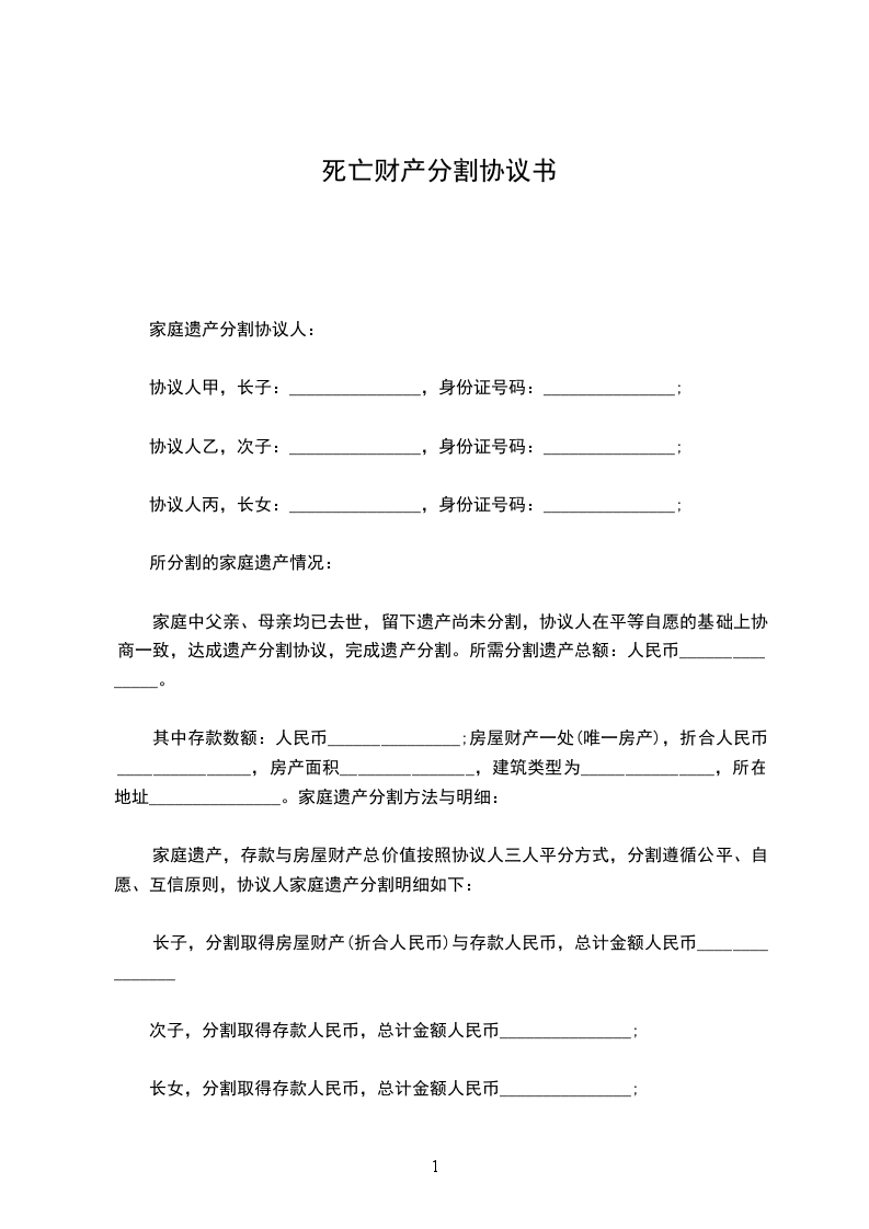 家庭中父亲、母亲均已去世,留下遗产尚未分割,协议人在平等自愿的基础上协商一致,达成遗产分割协议,完成遗产分割。所需分割遗产总额:人民币_______________。