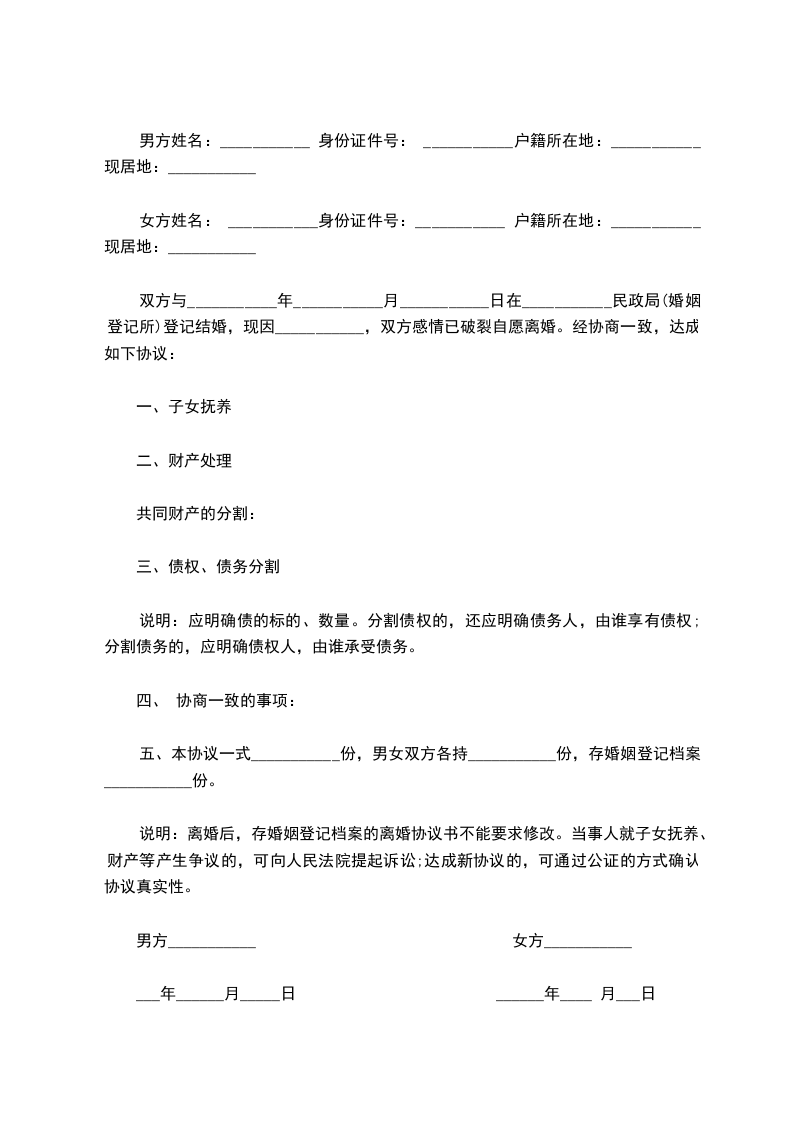 1、男女双方自愿于本协议生效之日解除夫妻关系(结婚证号:)