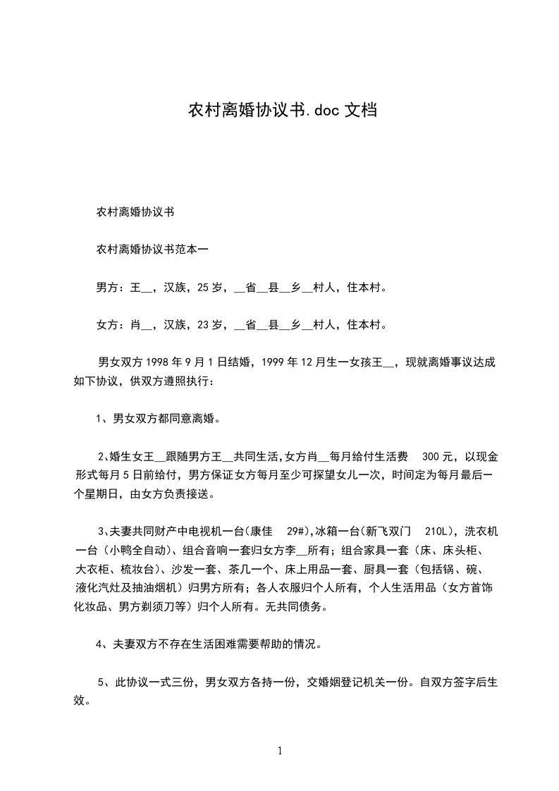 男女双方1998年9月1日结婚,1999年12月生一女孩王__,现就离婚事议达成如下协议,供双方遵照执行: