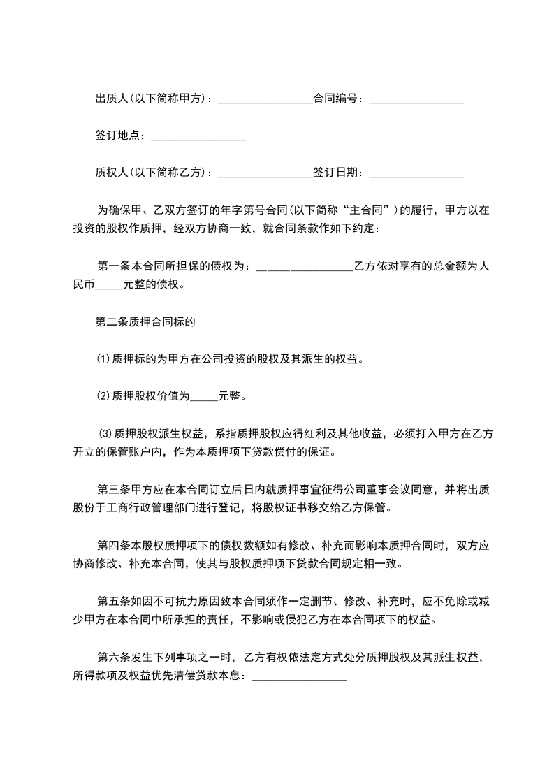 第三条甲方应在本合同订立后____日内就质押事宜征得_____公司董事会议同意,并将出质股份于股东名册上办理登记手续,将股权证书移交给乙方保管。