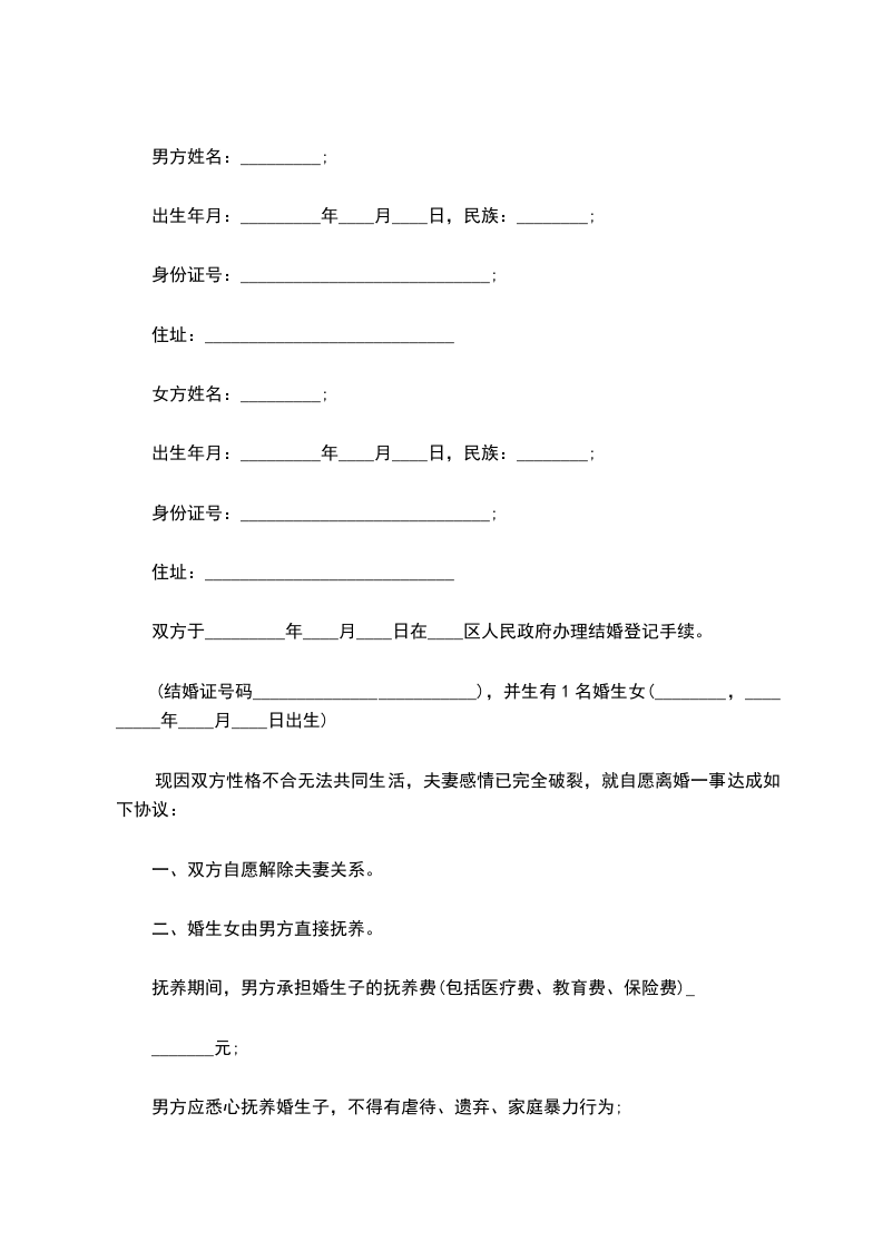 男、女双方于______年_______月_______日在办理结婚登记手续。婚后感情一般,因双方性格不合,夫妻感情已完全破裂,没有和好可能,无法共同生活。现双方就自愿离婚一事达成如下协议:_________________