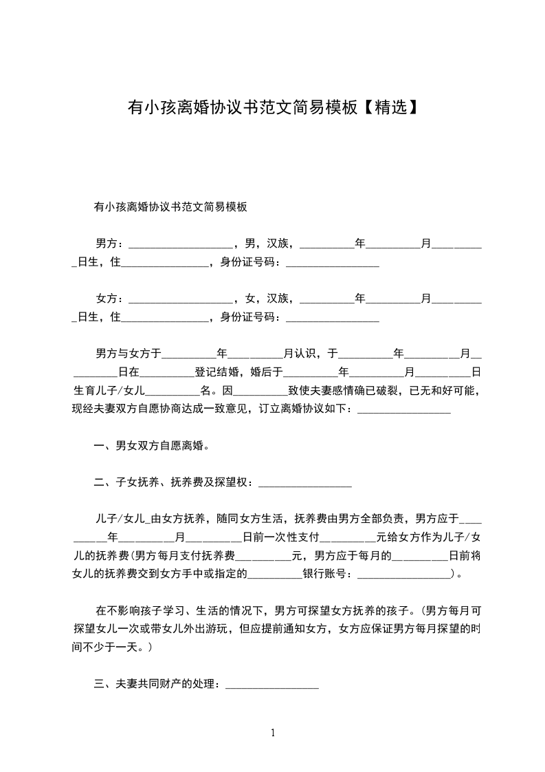有小孩离婚协议书范文