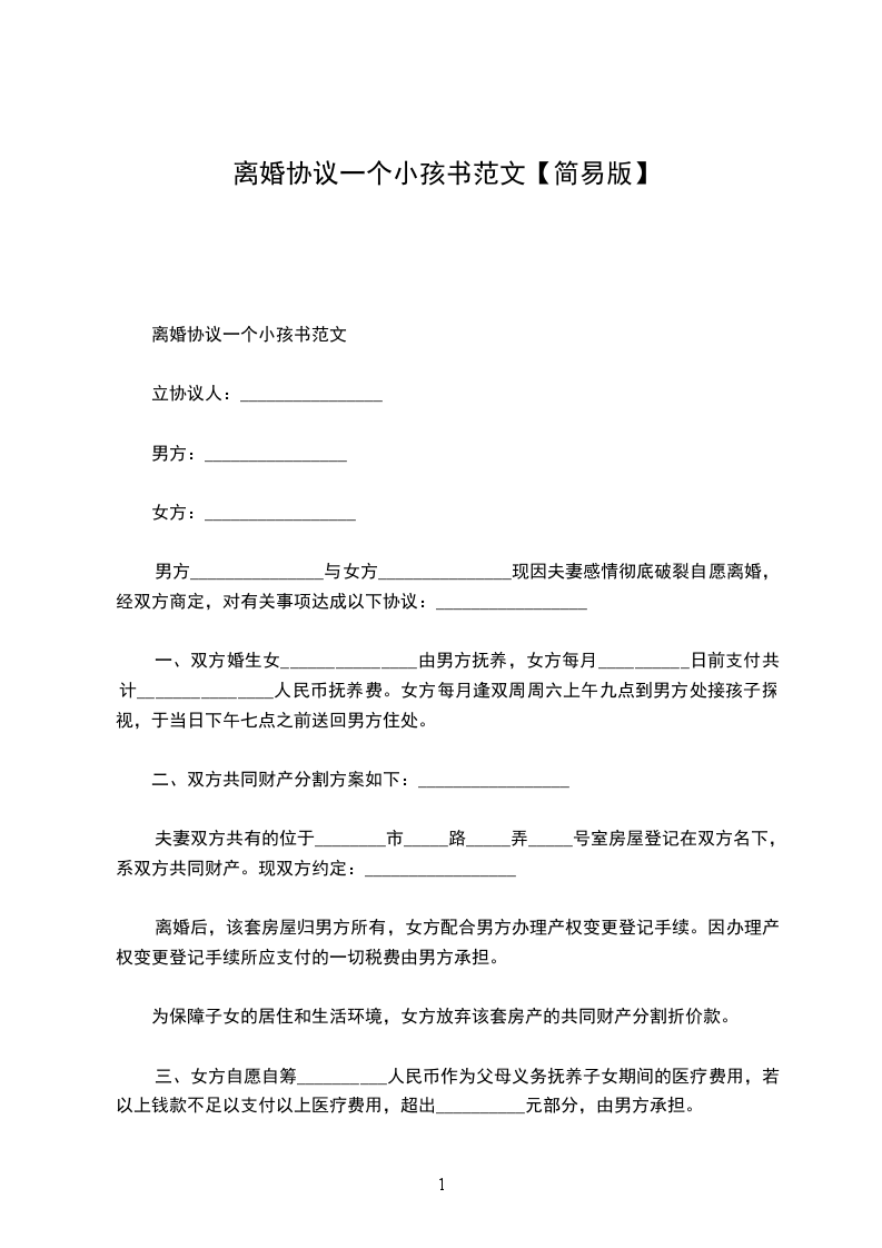 1、孩子_______________由__________(男/女)方抚养,随同__________(男/女)方生活,由__________(男/女)方负责孩子抚养费用和日常生活起居。