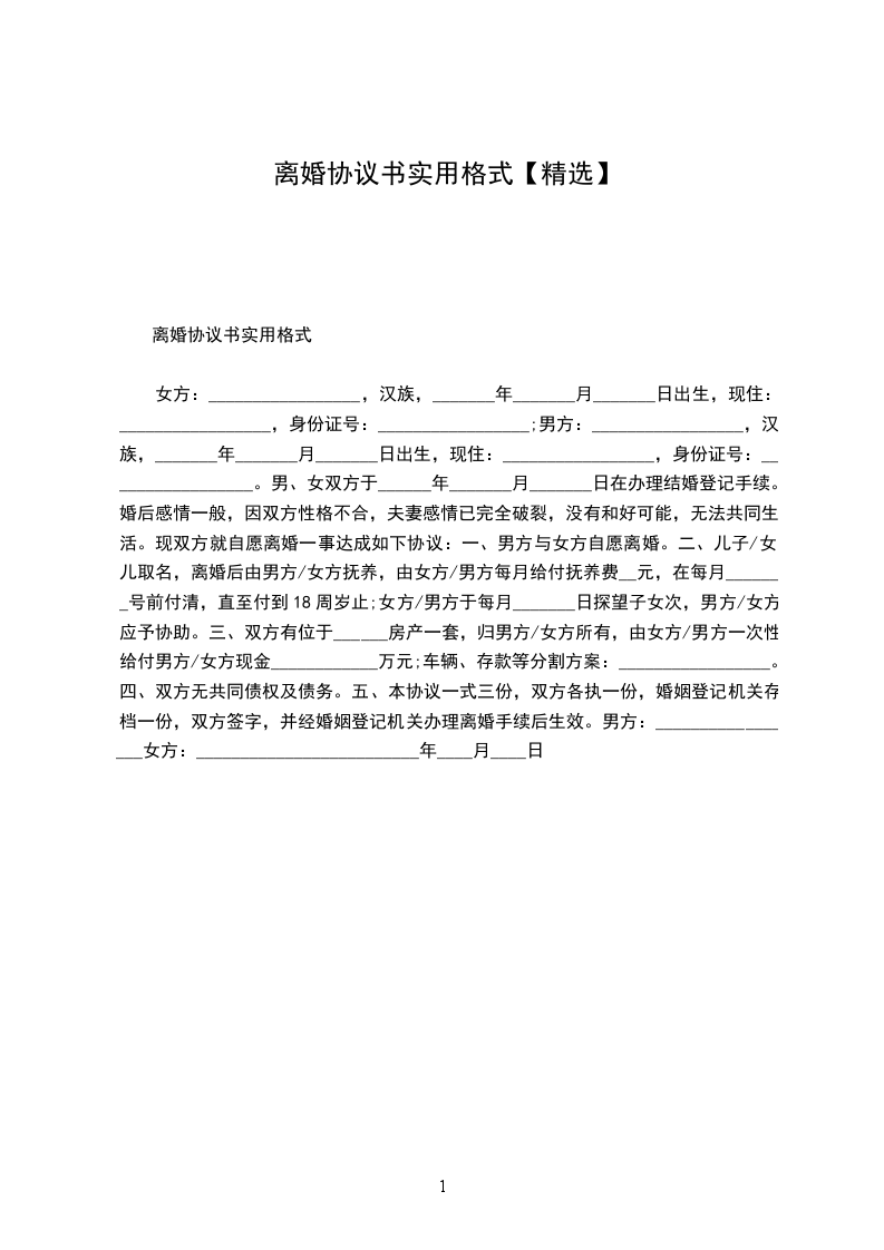 女方:_________________,汉族,_______年_______月_______日出生,现住:_________________,身份证号:_________________;男方:_________________,汉族,_______年_______月_______日出生,现住:_________________,身份证号:_________________。男、女双方于______年_______月_______日在办理结婚登记手续。婚后感情一般,因双方性格不合,夫妻感情已完全破裂,没有和好可能,无法共同生活。现双方就自愿离婚一事达成如下协议:一、男方与女方自愿离婚。二、儿子/女儿取名,离婚后由男方/女方抚养,由女方/男方每月给付抚养费__元,在每月_______号前付清,直至付到18周岁止;女方/男方于每月_______日探望子女次,男方/女方应予协助。三、双方有位于______房产一套,归男方/女方所有,由女方/男方一次性给付男方/女方现金____________万元;车辆、存款等分割方案:_________________。四、双方无共同债权及债务。五、本协议一式三份,双方各执一份,婚姻登记机关存档一份,双方签字,并经婚姻登记机关办理离婚手续后生效。男方:_________________女方:_________________________年____月____日