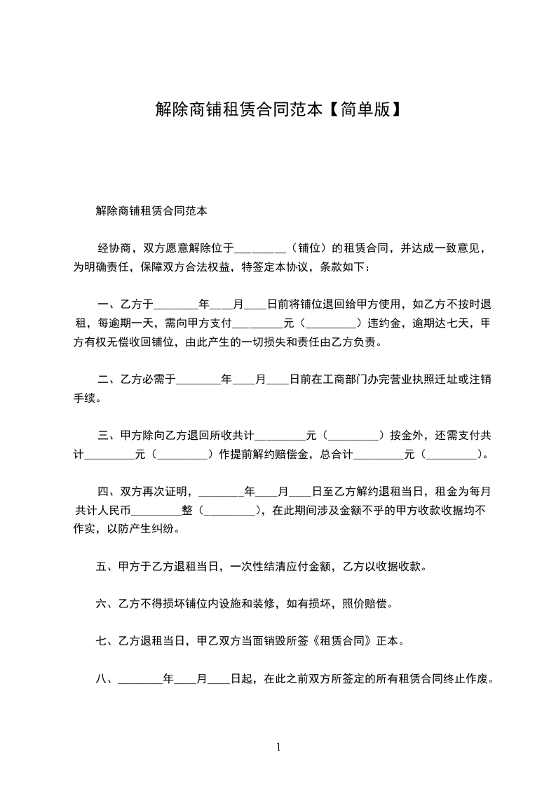 解除商铺租赁合同范本