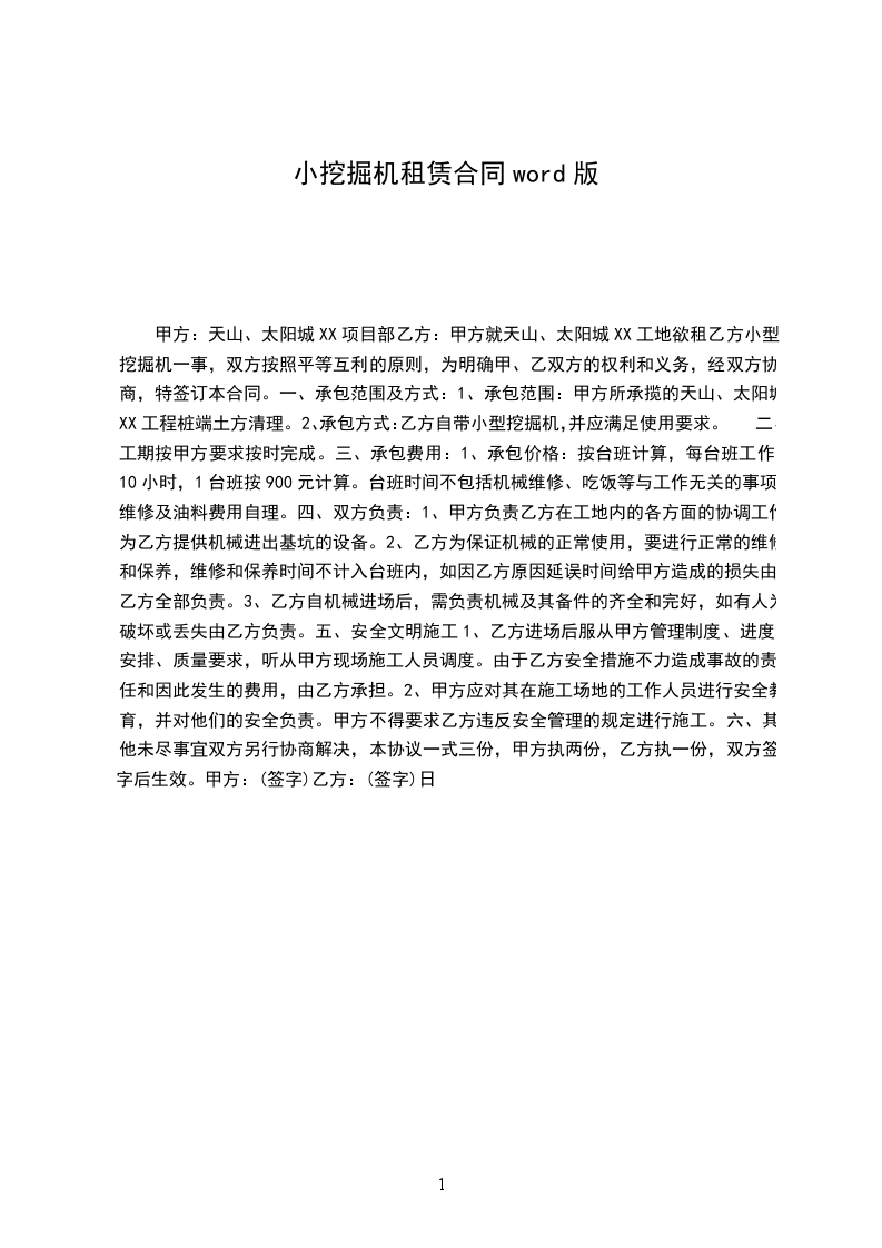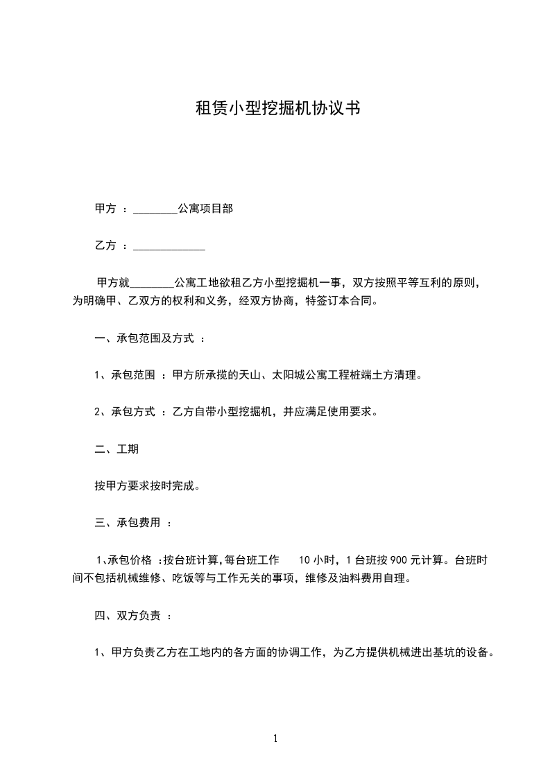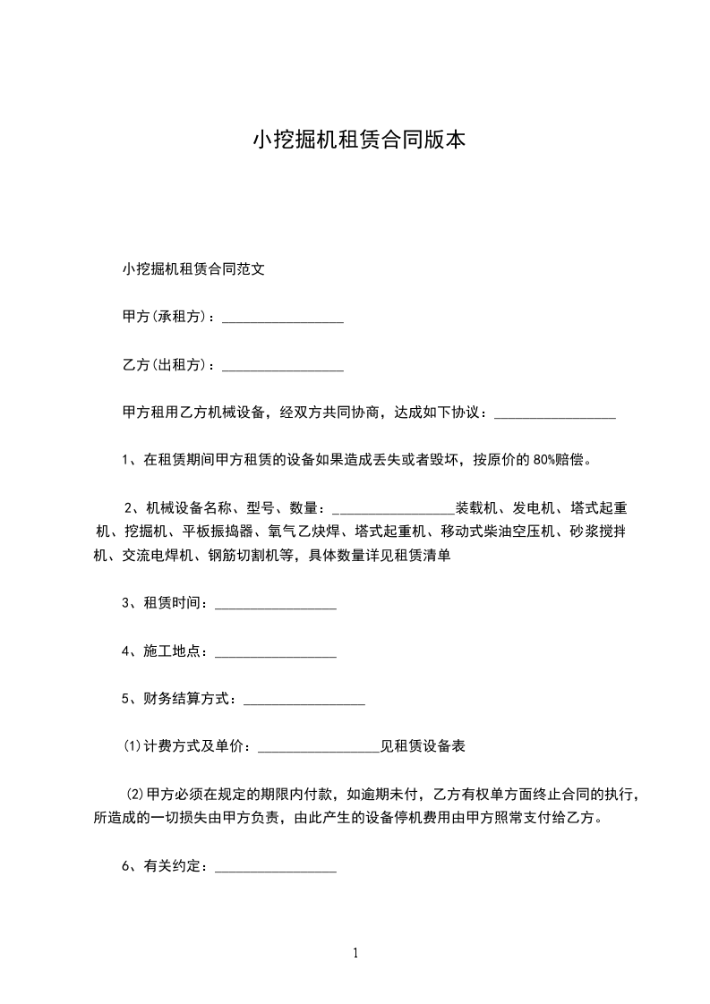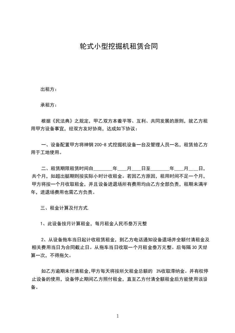 小挖掘机租赁合同
