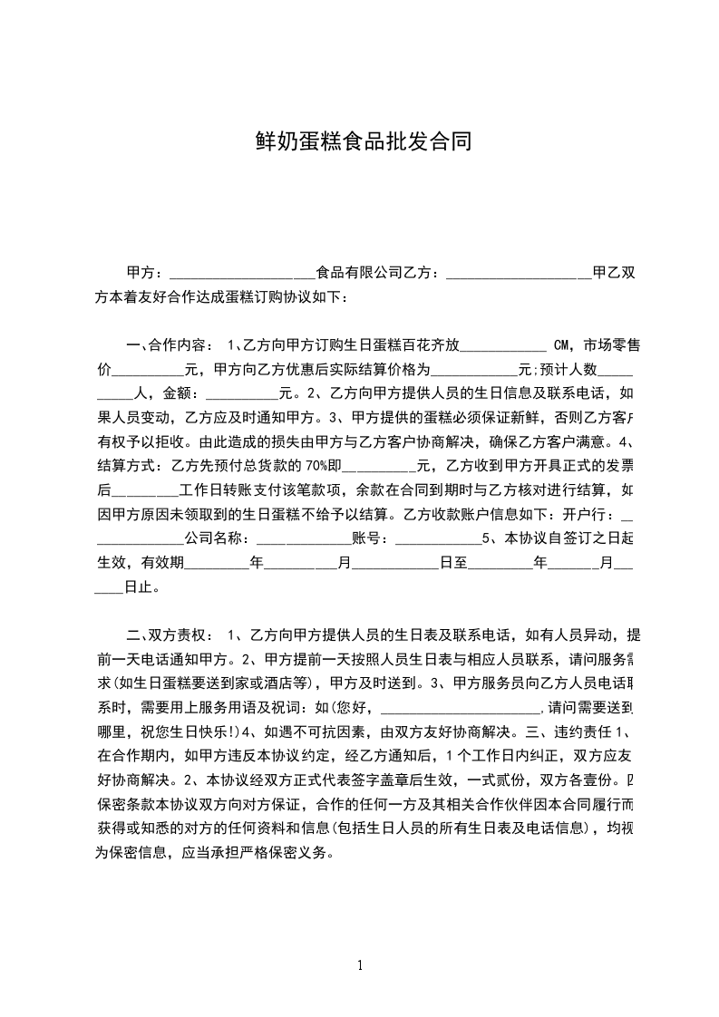 一、合作内容:1、乙方向甲方订购生日蛋糕百花齐放____________CM,市场零售价__________元,甲方向乙方优惠后实际结算价格为____________元;预计人数__________人,金额:__________元。2、乙方向甲方提供人员的生日信息及联系电话,如果人员变动,乙方应及时通知甲方。3、甲方提供的蛋糕必须保证新鲜,否则乙方客户有权予以拒收。由此造成的损失由甲方与乙方客户协商解决,确保乙方客户满意。4、结算方式:乙方先预付总货款的70%即__________元,乙方收到甲方开具正式的发票后_________工作日转账支付该笔款项,余款在合同到期时与乙方核对进行结算,如因甲方原因未领取到的生日蛋糕不给予以结算。乙方收款账户信息如下:开户行:______________公司名称:_____________账号:____________5、本协议自签订之日起生效,有效期_________年__________月____________日至_________年_______月_______日止。