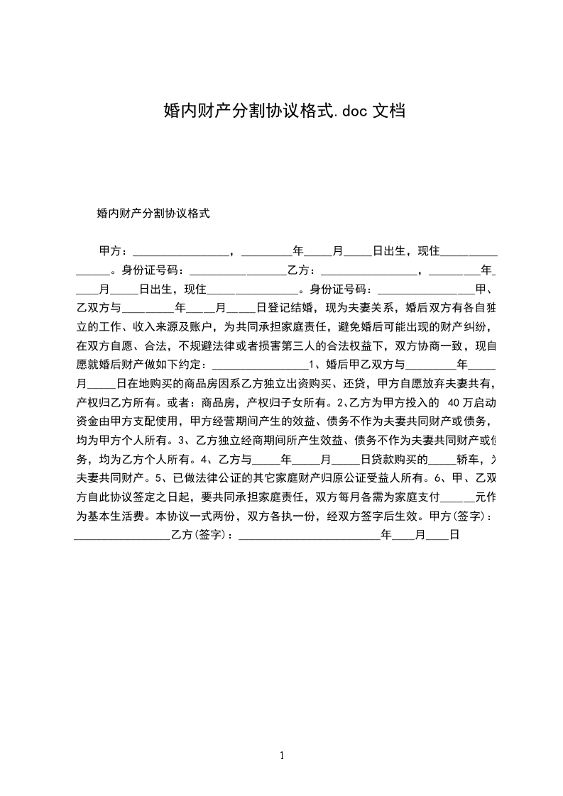 婚内财产分割协议格式