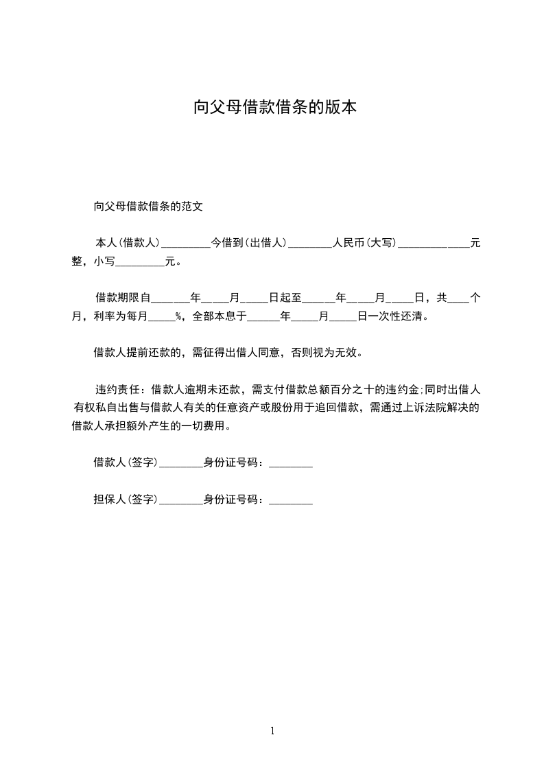 甲方_______________(身份证号:_________________)今借乙方_______________(身份证号:_________________)人民币(外币须注明币种)元正。(大写)借款期限为:_________________年,从_____年_____月_____日到_____年_____月_____日。借款利息为:_________________%(年利率)违约责任:_________________如果甲方不能按期归还本息,付违约金_______________。借款人(签字并按手印):______________________年_____月_____日