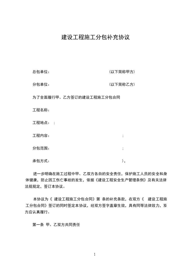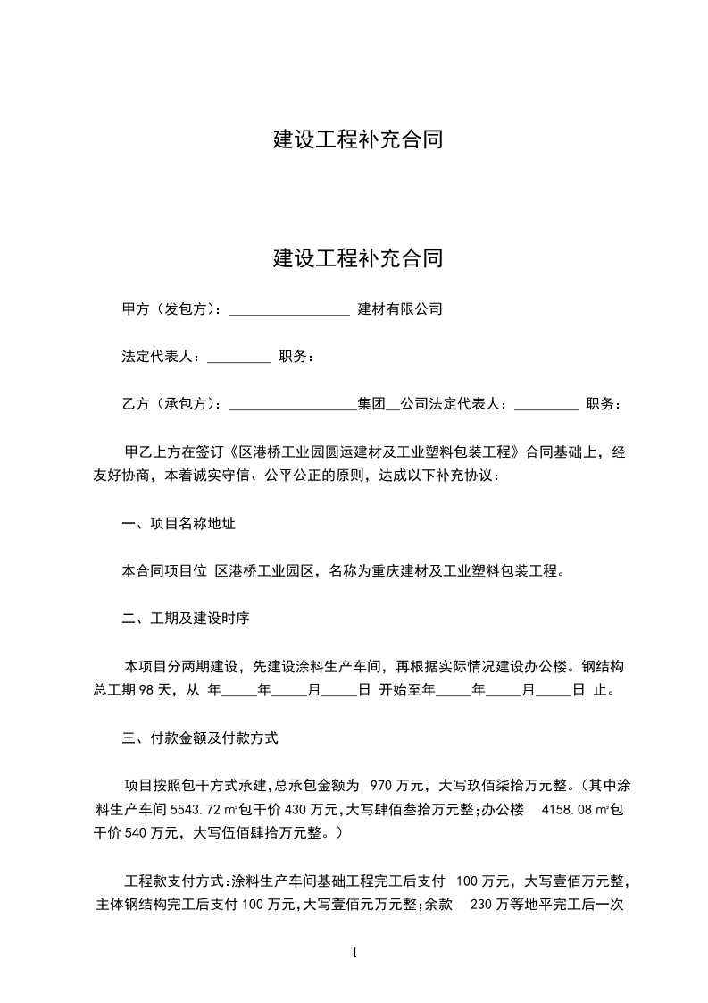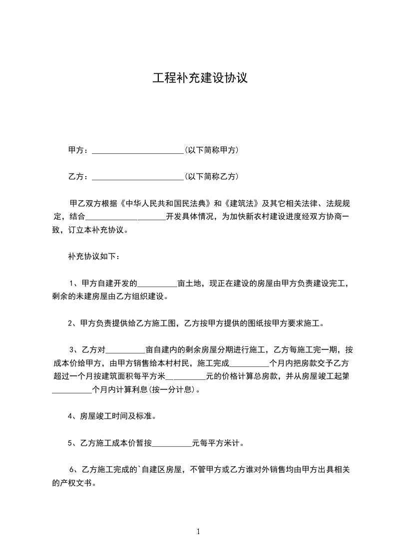 工程建设合同补充协议范文