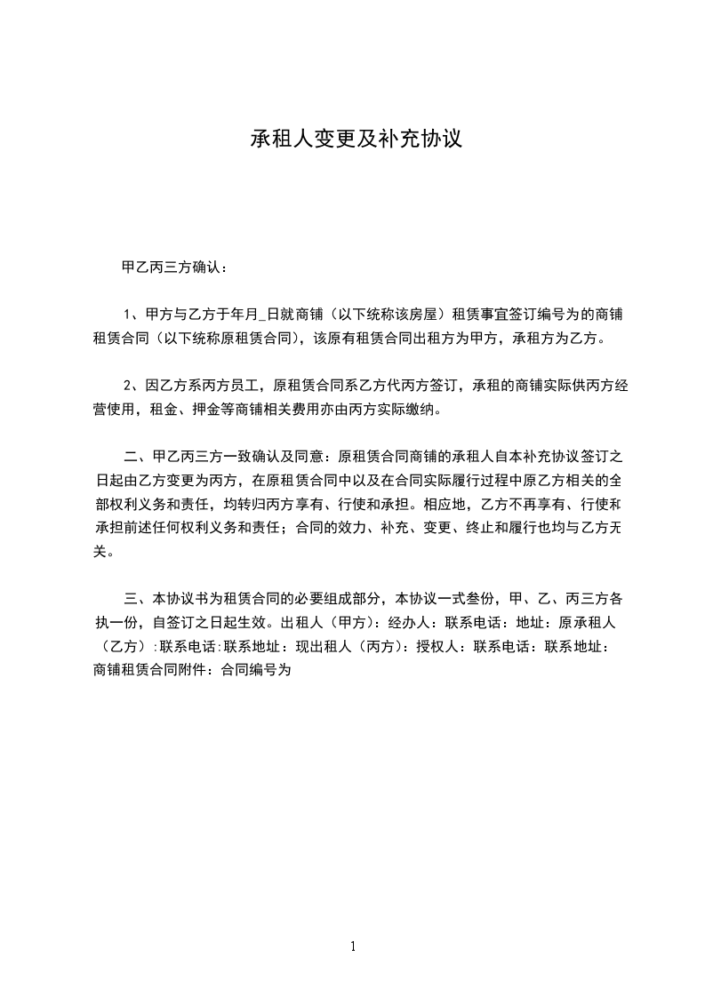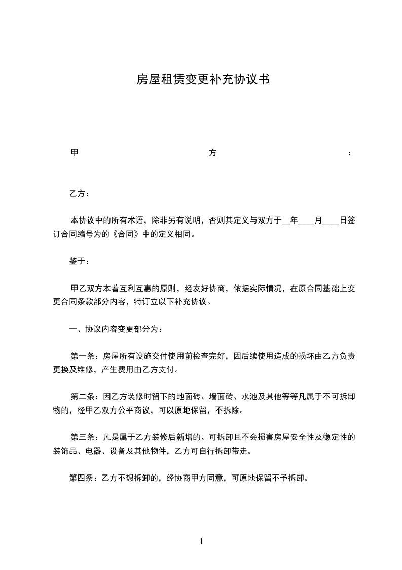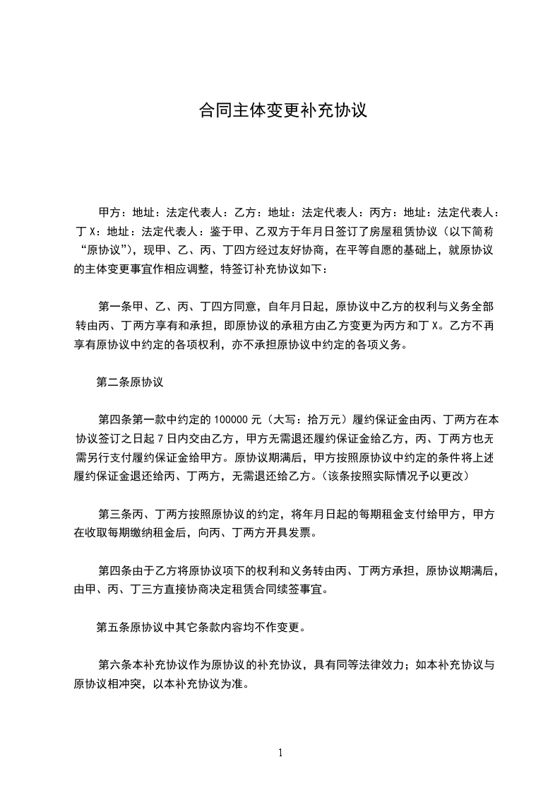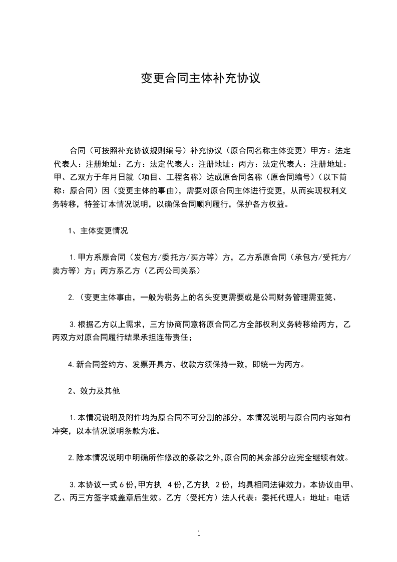 4、生效及其它本协议是原合同不可分割的组成部分,与原合同具有同等法律效力。除本协议变更的内容外,原合同中的其他条款仍然适用,对双方有约束力。本协议自双方签字盖章之日起生效,一式份,双方各执份,具有同等法律效力。