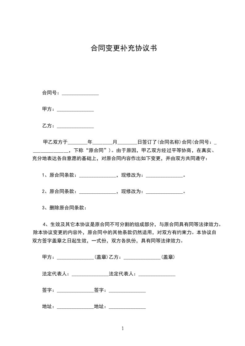 甲乙双方于________年________月________日签订了(合同名称)合同(合同号:_______________,下称“原合同”)。由于原因,甲乙双方经过平等协商,在真实、充分地表达各自意愿的基础上,对原合同内容作出如下变更,并由双方共同遵守: