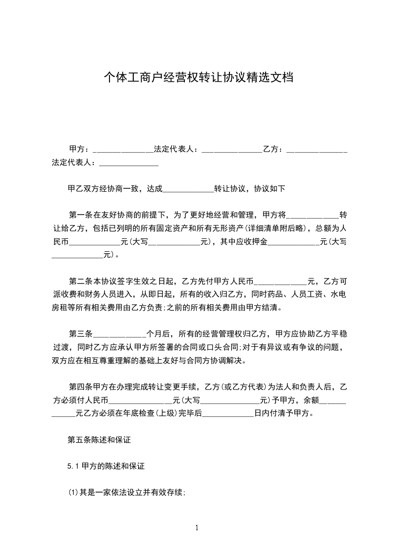 1.转让方同意将该个体工商户的资产(评估价为人民币________________元)及个体工商户的名称和印章转让给受让方。