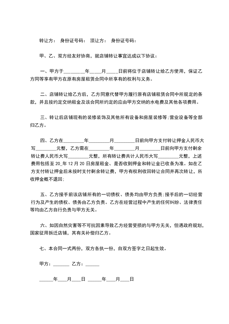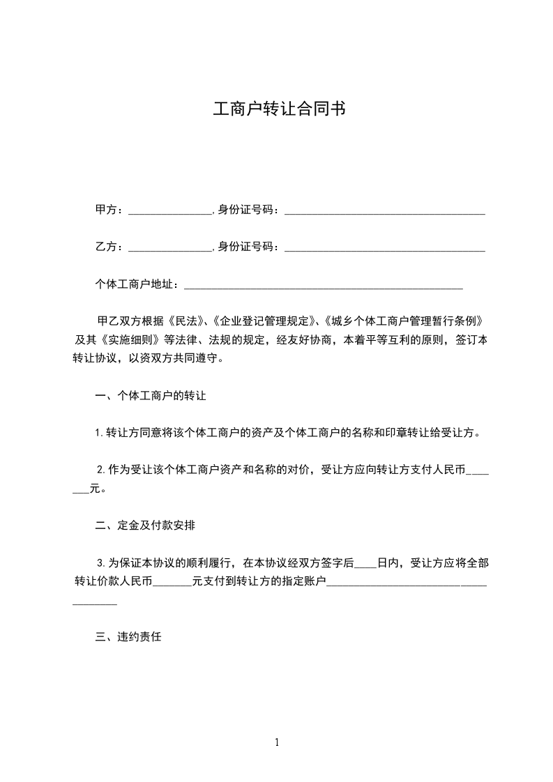 乙方(受让方):_______________身份证号码:_________________个体工商户地址:______________
