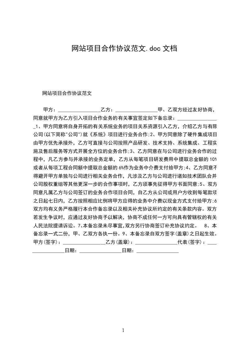 甲方:_________________乙方:_________________甲、乙双方经过友好协商,同意就甲方为乙方引入项目合作业务的有关事宜签定如下备忘录:_________________1、甲方同意将自身开拓的有关系统业务的项目关系资源引入乙方,介绍乙方与有限公司(以下简称"公司")就《系统》项目进行业务合作;2、甲方同意除了硬件集成项目由甲方优先承接外,乙方可直接与公司按照产品研发、技术支持、系统集成、工程实施及售后服务等方式开展全方位的业务合作;3、乙方同意在与公司进行业务合作的过程中,凡乙方参与并承接的业务定单,乙方从每笔项目研发费用中提取总金额的10%或者从每项工程合同额中提取总金额的6%作为业务中介费支付给甲方;4、乙方同意不得避开甲方单独与公司进行相关业务合作,凡涉及乙方与公司进行诸如技术团队合并、公司股权重组等其他更深一步的合作事项时,乙方须事先征得甲方书面同意;5、双方同意凡属乙方与公司签订的业务合作项目合同,自乙方从公司或用户方收到每笔款项之日起七日内,乙方按照相应比例将甲方应得的业务中介费以现金方式支付给甲方;6、双方均有义务严格履行本合作备忘录以及相关补充协议所约定的有关条款内容。双方若发生争议时,应通过友好协商予以解决,协商不成任何一方可向具有管辖权的有关人民法院提请诉讼。7、本备忘录未尽事宜,双方另行协商签订补充协议约定。8、本备忘录一式二份,甲、乙双方各执一份。9、本备忘录自双方签字(盖章)之日起生效。甲方(签字):_________________乙方(盖章):_________________代表(签字):_________________日期:_________________日期:_________________