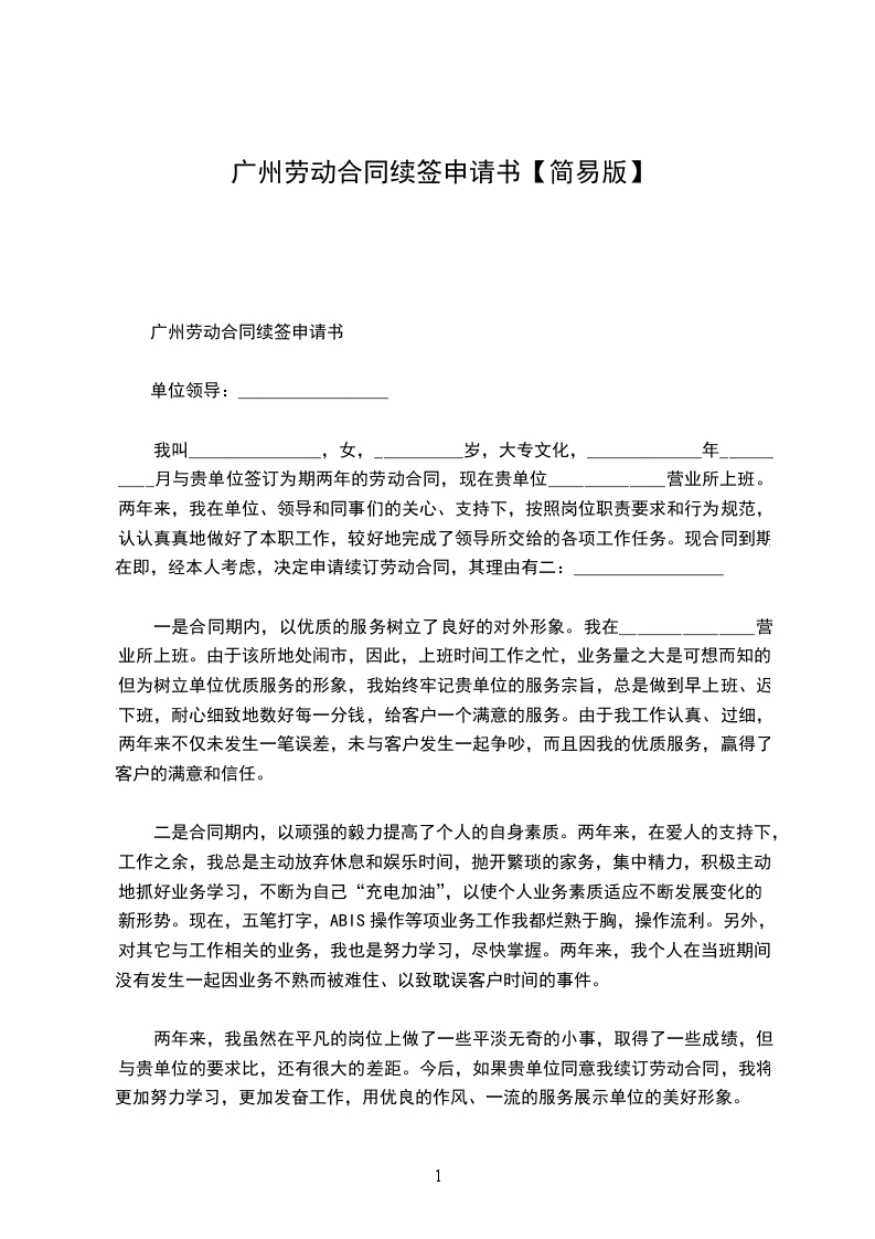 我叫_______________,女,__________岁,大专文化,_____________年__________月与贵单位签订为期两年的劳动合同,现在贵单位_____________营业所上班。两年来,我在单位、领导和同事们的关心、支持下,按照岗位职责要求和行为规范,认认真真地做好了本职工作,较好地完成了领导所交给的各项工作任务。现合同到期在即,经本人考虑,决定申请续订劳动合同,其理由有二:_________________