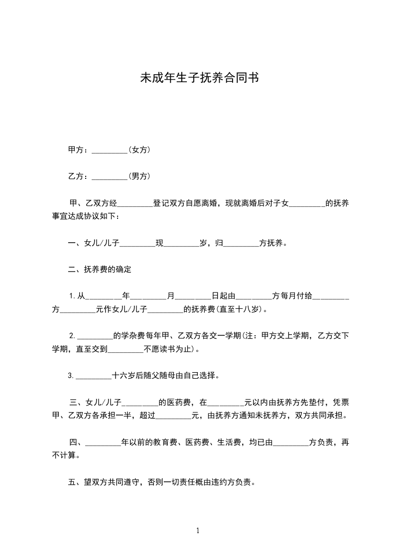 1.从_________年_________月_________日起由_________方每月付给_________方_________元作女儿/儿子_________的抚养费(直至十八岁)。