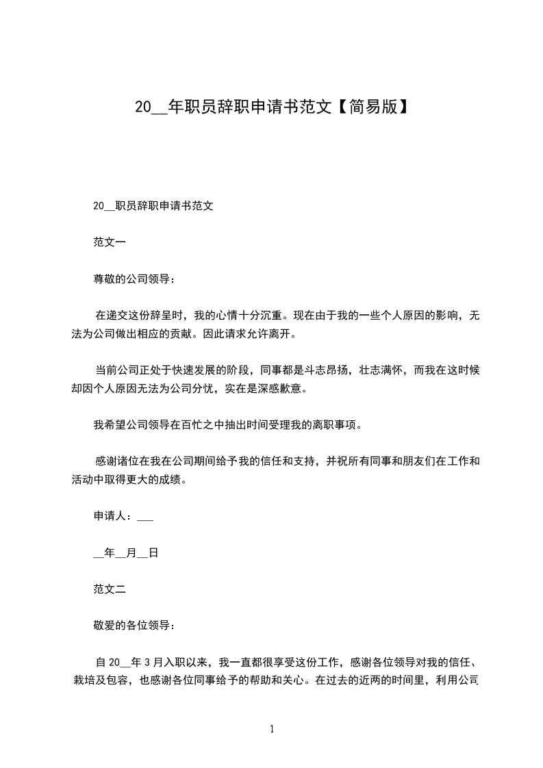 20__职员辞职申请书范文