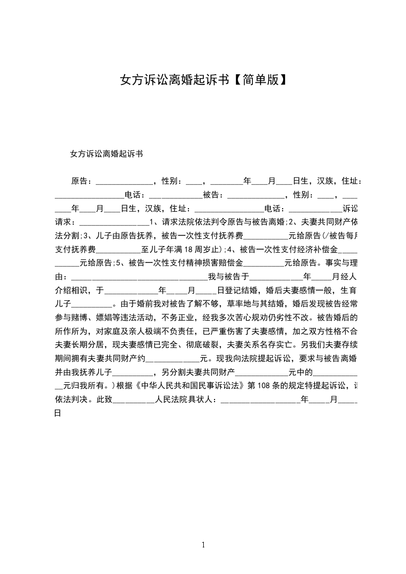 女方诉讼离婚起诉书