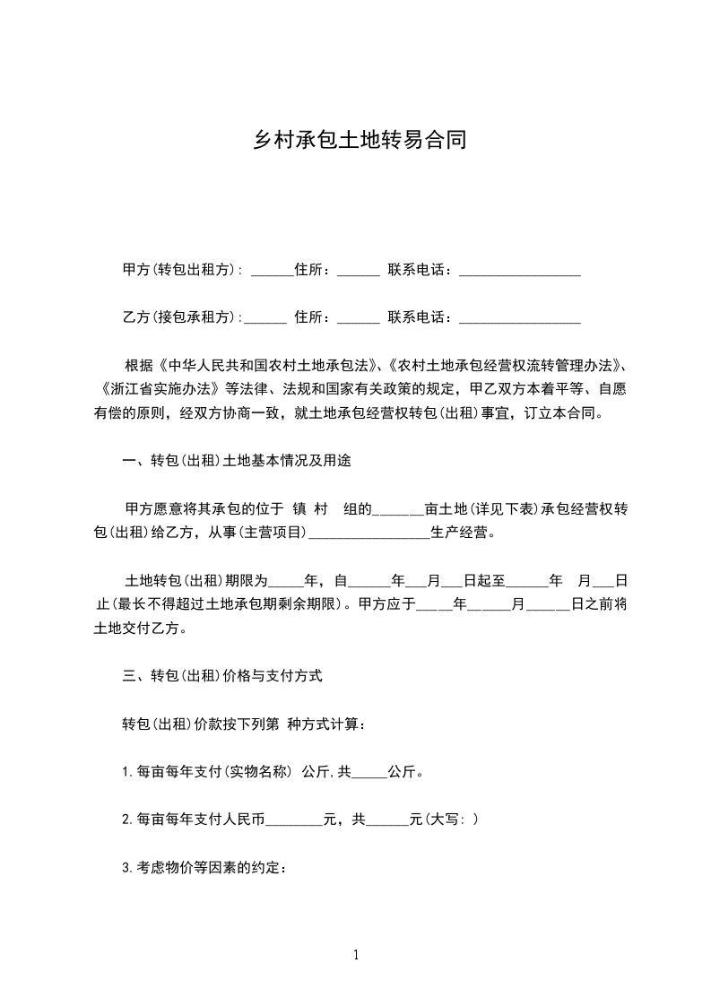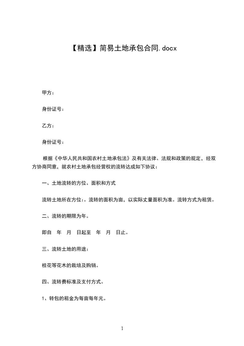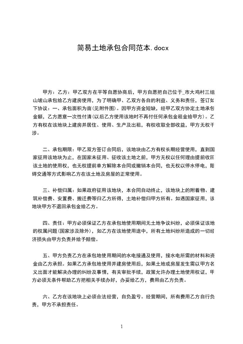 甲方现有土地_______________亩承包给乙方,为坚持农村土地集体所有制,保护农民使用土地的合法权益,依据《农村土地承包法》,本着平等互利的原则,经双方协商,在平等、互利、资源的基础上达成以下协议: