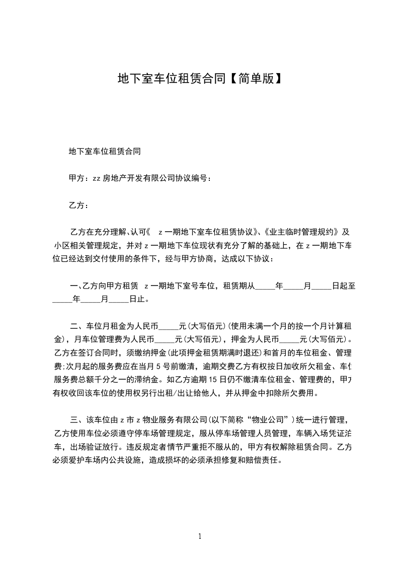 一、乙方向甲方租赁z一期地下室号车位,租赁期从_____年_____月_____日起至_____年_____月_____日止。