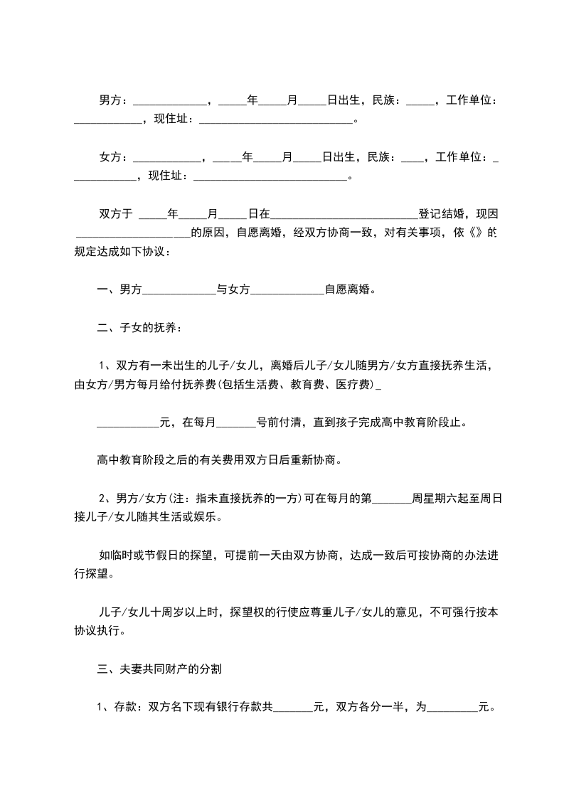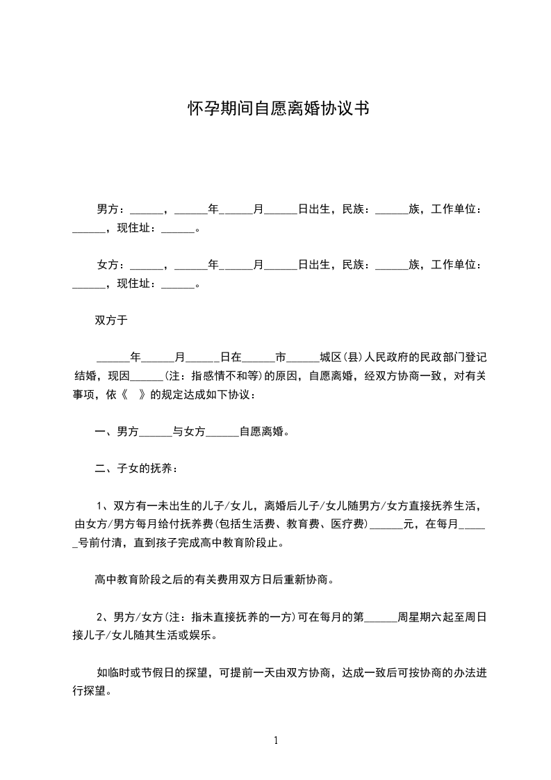 1、双方有一未出生的儿子/女儿,离婚后儿子/女儿随男方/女方直接抚养生活,由女方/男方每月给付抚养费(包括生活费、教育费、医疗费)__________元,在每月__________号前付清,直到孩子完成高中教育阶段止。高中教育阶段之后的有关费用双方日后重新协商。