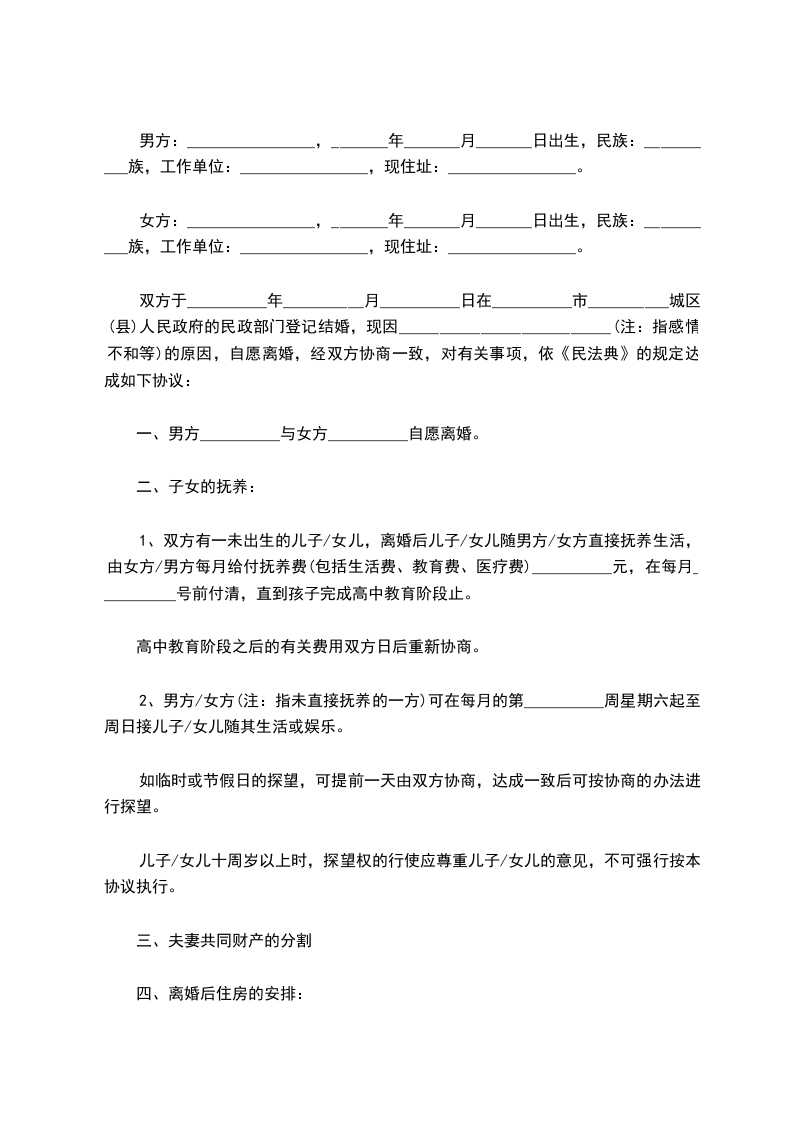 双方于__________年__________月__________日在__________市__________城区(县)人民政府的民政部门登记结婚,现因__________________________(注:指感情不和等)的原因,自愿离婚,经双方协商一致,对有关事项,依《民法典》的规定达成如下协议: