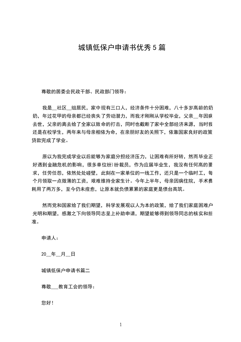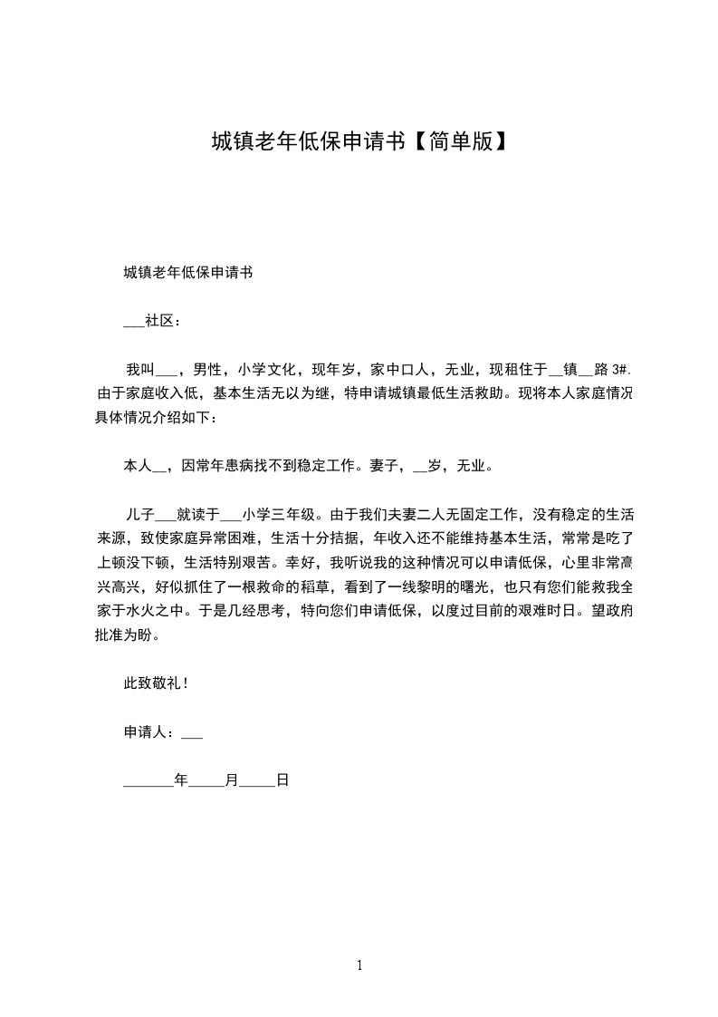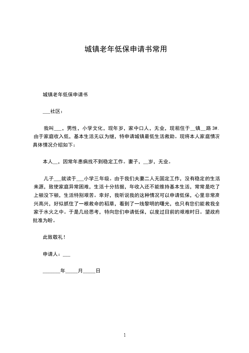 城镇老年低保申请书